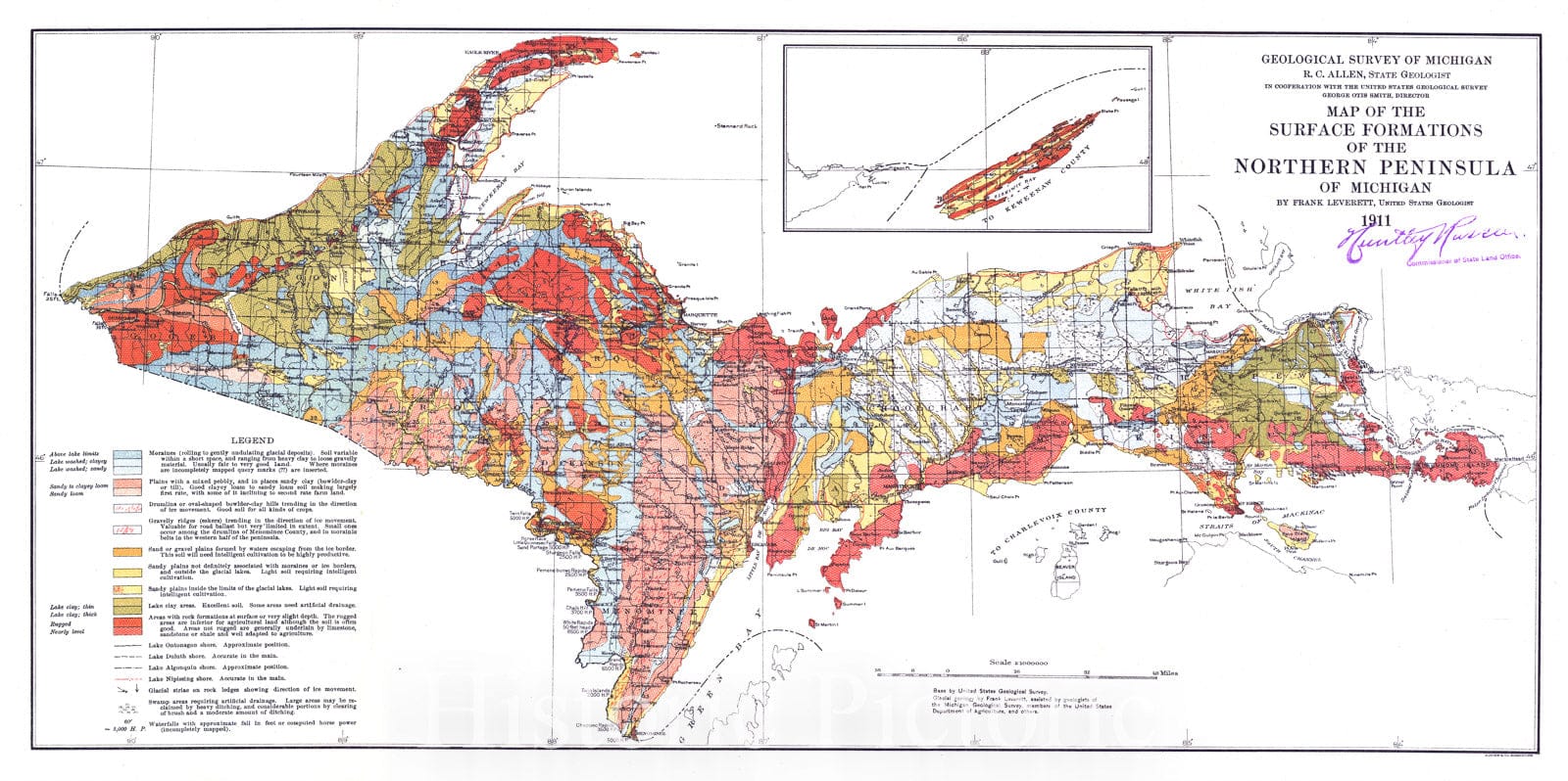 Historic Map : 1911 Map of the Surface Formations of the Northern Peninsula of Michigan : Vintage Wall Art