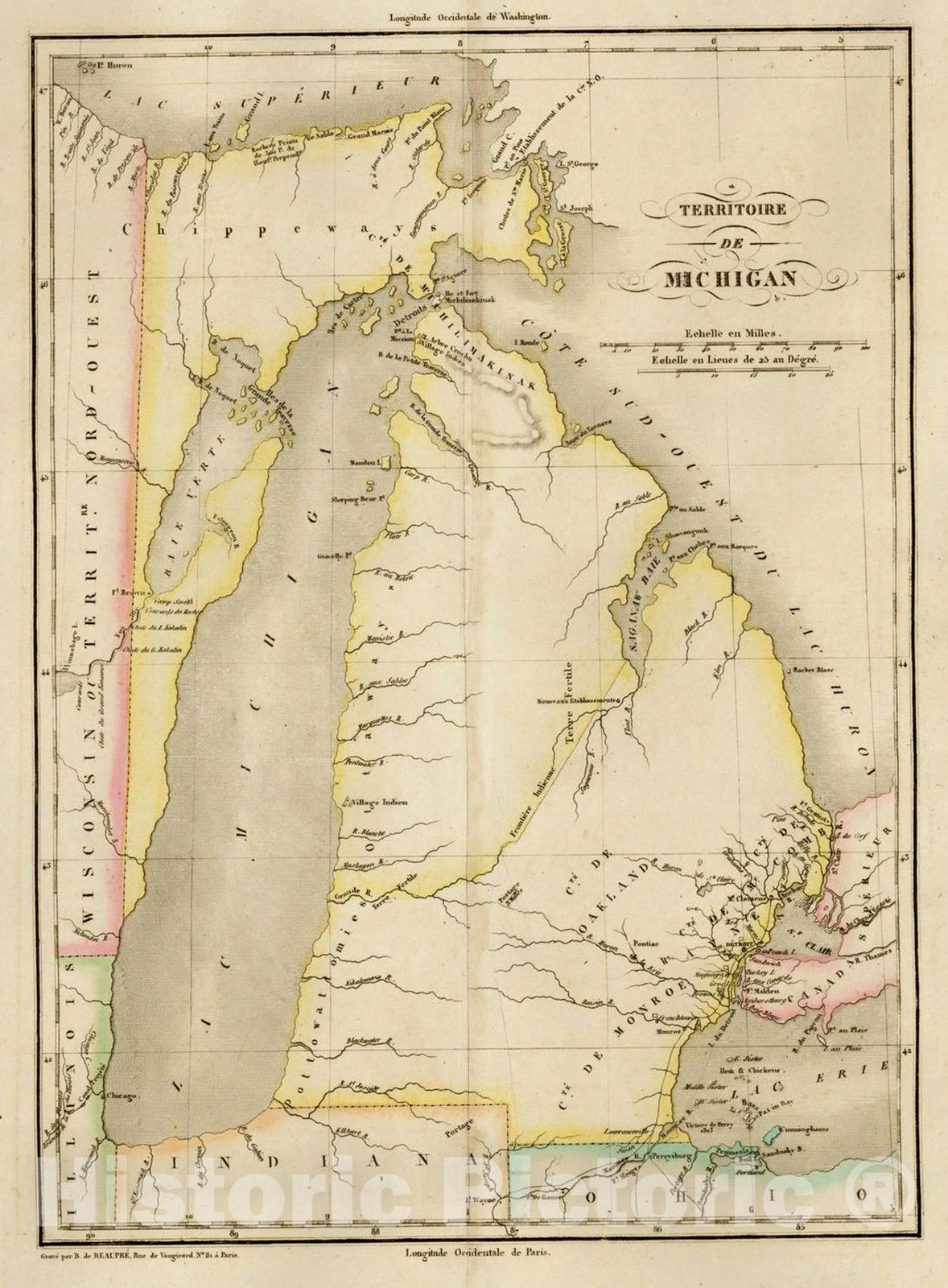 Historic Map : [First map of Michigan Territory published in Europe] Carte Geographique, Statistique et Historique De Michigan, 1825, Jean Alexandre Buchon, Vintage Wall Art