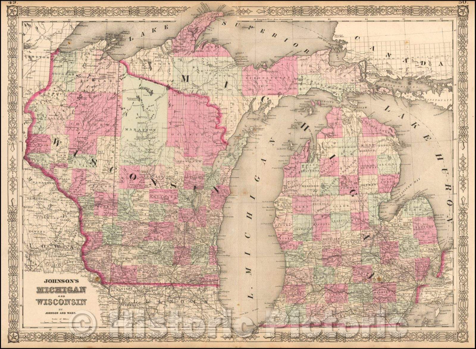 • .Historic Map - Johnson's Michigan and Wisconsin, 1863, Benjamin P Ward - Vintage Wall Art