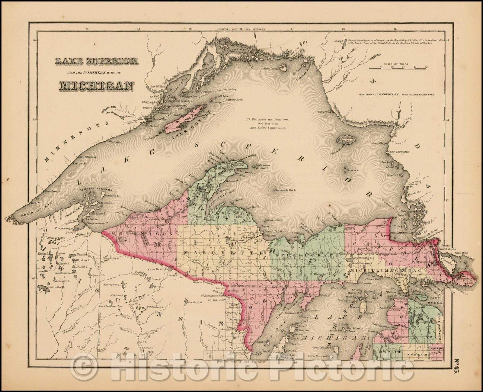 • .Historic Map - Lake Superior and the Northern Part of Michigan, 1857, Joseph Hutchins Colton - Vintage Wall Art