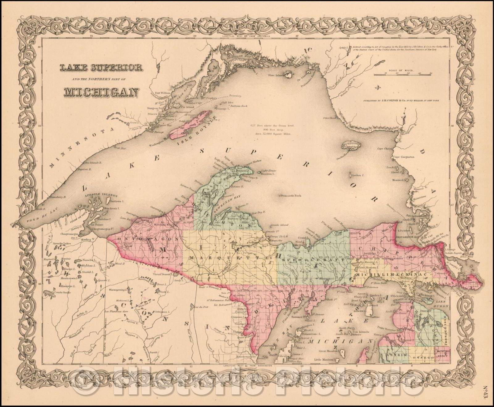 • .Historic Map - Lake Superior and the Northern Part of Michigan, 1859, Joseph Hutchins Colton - Vintage Wall Art