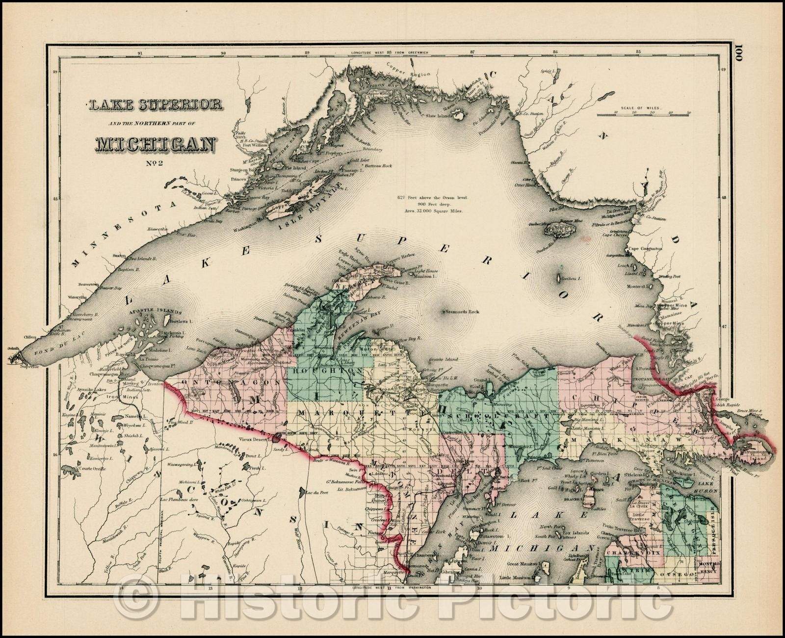 Historic Map - Lake Superior and the Northern Part of Michigan, 1875, O.W. Gray - Vintage Wall Art