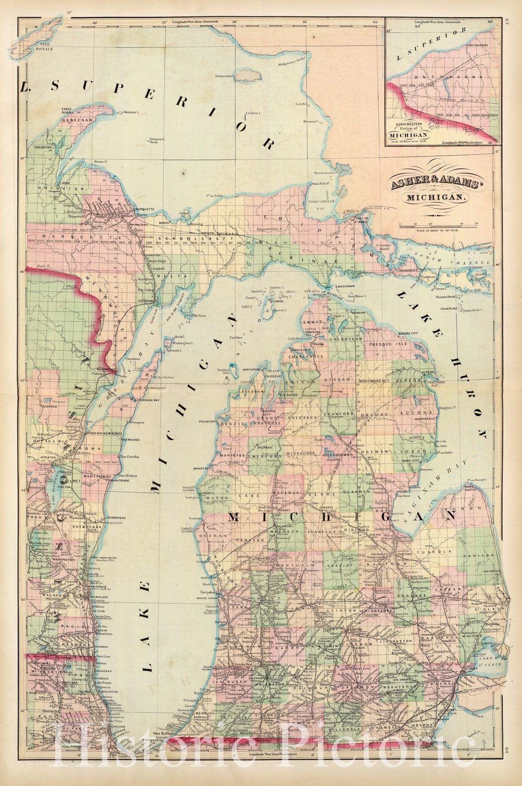 Asher & Adams' Michigan. Entered according to Act of Congress in the year 1874 by Asher & Adams ... at Washington. (New York, 1874) | Asher & Adams' new commercial, topographical, and statistical atlas and gazetteer of the United States: with maps showing the Dominion of Canada, Europe and the World ... Compiled, drawn, and engraved under the supervision of the publishers ... New York: Asher & Adams, 59 Beekman St. (on verso) Entered ... One Thousand Eight Hundred and Seventy-four, by Asher & Adams ... Washington. Electrotyped at the Franklin Type Foundry, Cincinnati. | This was one of the first United States atlases to exclusively feature railroad lines, showing minimal topography (in this later edition more topographical features are added, earlier editions have fewer features shown ) and only showing towns on or next to the railroads lines. We find the maps most interesting and beautiful, although some might find them a bit spare. This copy was published late in 1874 and is the most complete edition. Contains maps of Washington, Wyoming, Montana, New Mexico, Arizona, Western Texas, etc. (similar to our early 1874 edition). The western United States maps are especially interesting. Full color. Bound in quarter leather dark brown and red cloth covered boards stamped with the title "Asher & Adams' new commercial and statistical alas and gazetteer of the United States." in gilt; the same title is blind stamped on the back cover. The remaining leather of the original spine reads "Asher & Adams' atlas and gazetteer of the U.S." Page numbering discontinuous.