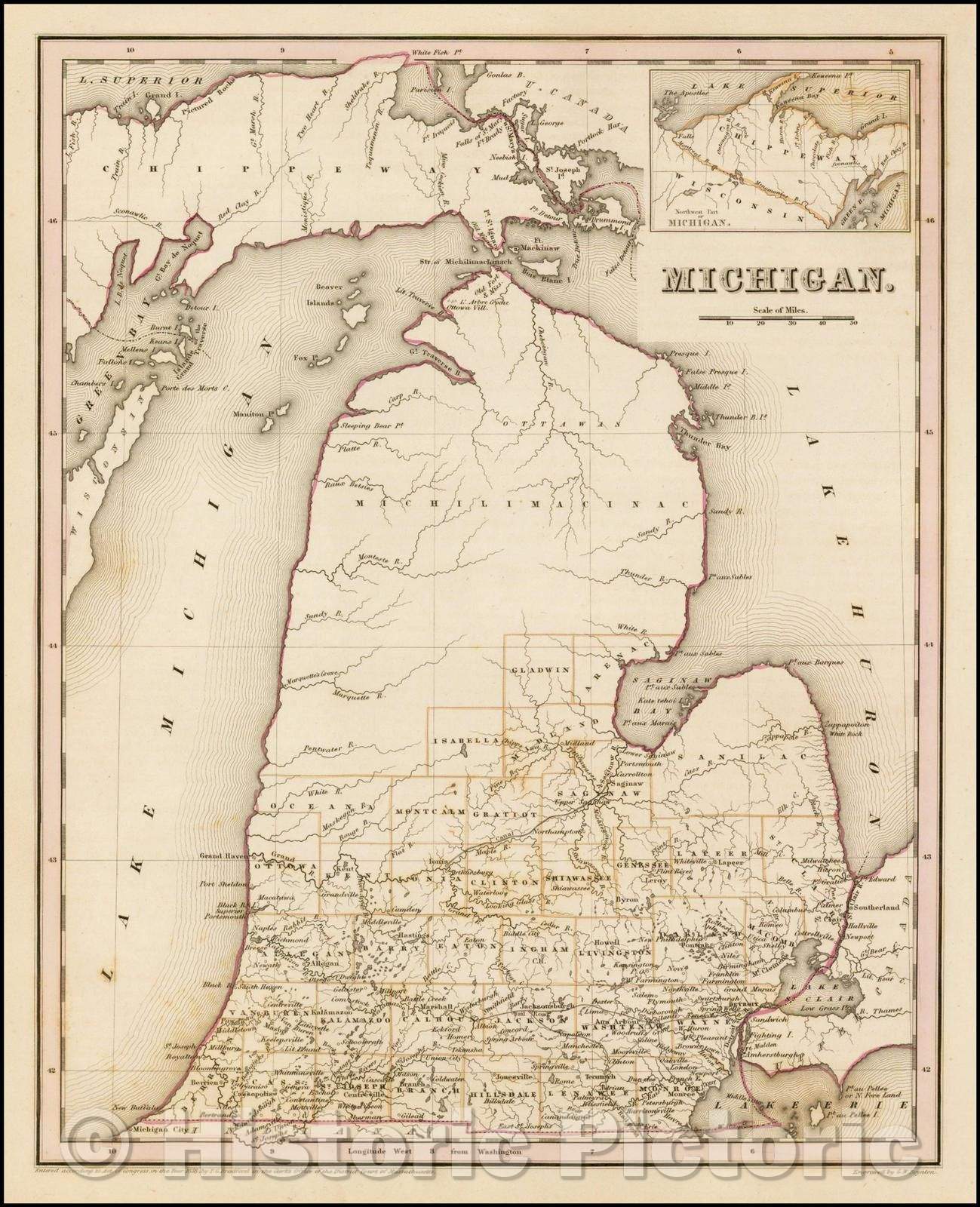 Historic Map - Michigan (Rare 1st edition!), 1838, Thomas Gamaliel Bradford - Vintage Wall Art
