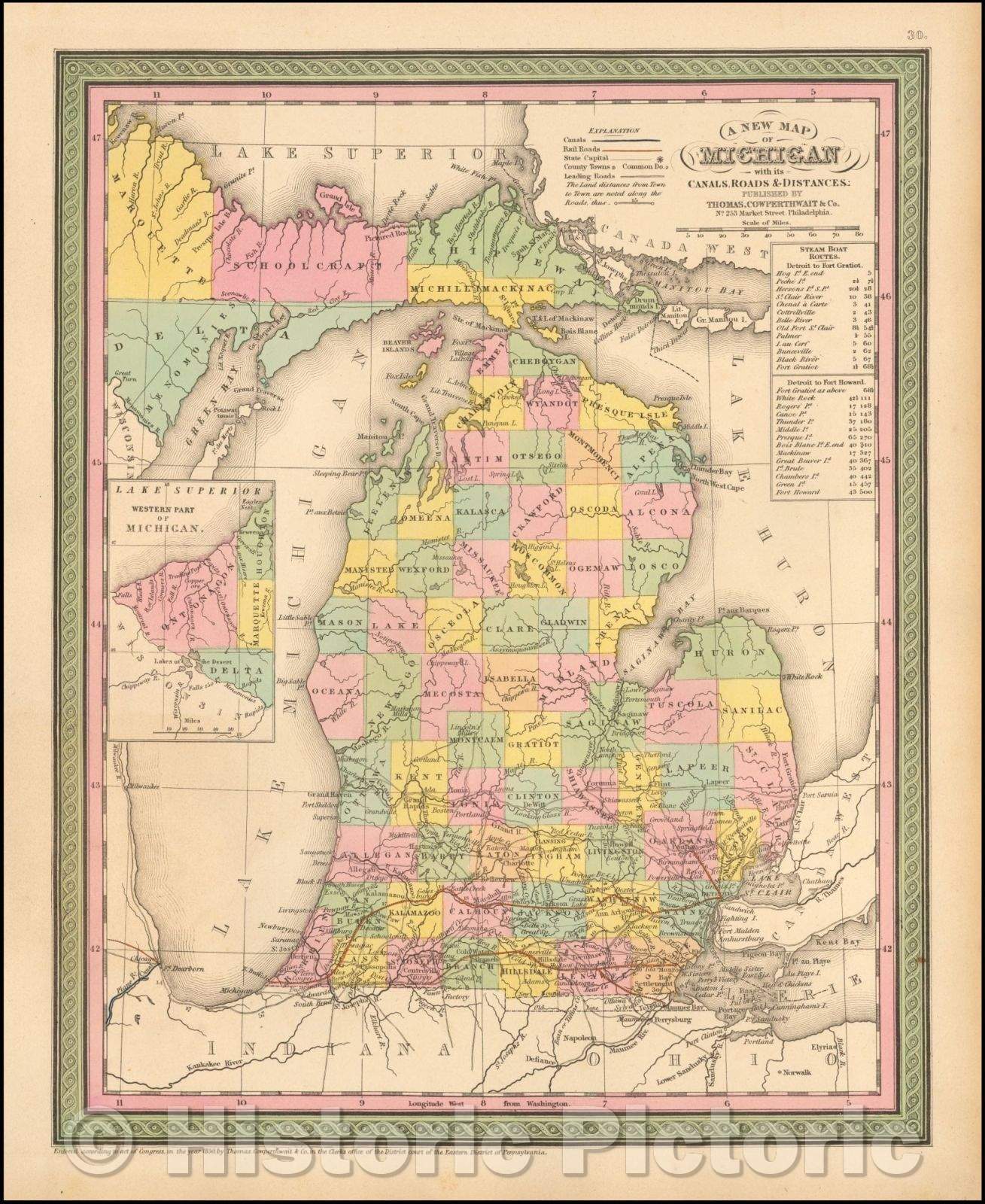 • .Historic Map - Michigan with its Canals, Roads & Distances, 1852, Thomas Cowperthwait & Co. - Vintage Wall Art