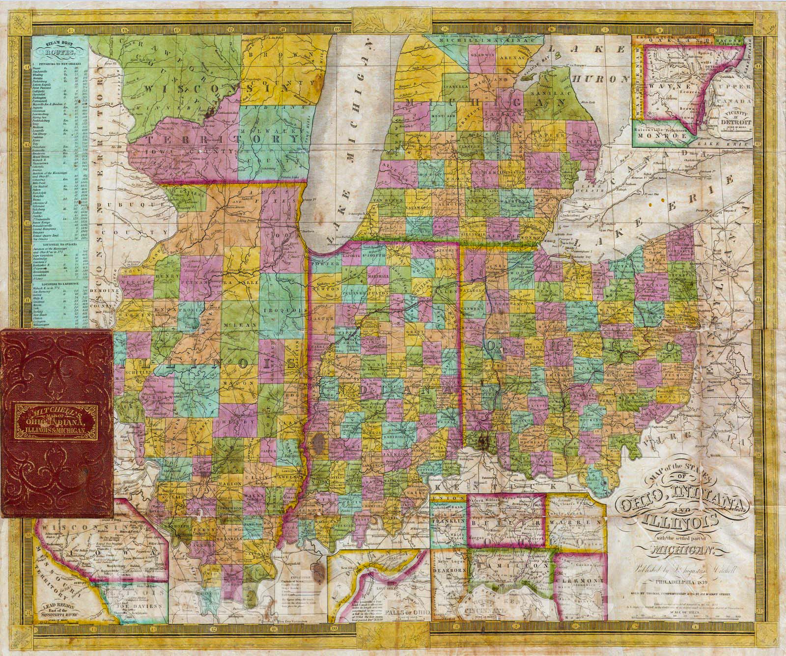 A fine and rare 1839 S. A. Mitchell pocket map depicting the states of Ohio, Indiana, Illinois, and Michigan. Insets include, 'Vicinity of Detroit,' 'Vicinity of Cincinnati,' 'Falls of Ohio,' 'Lead Region East of the Mississippi.' A chart on the left-h