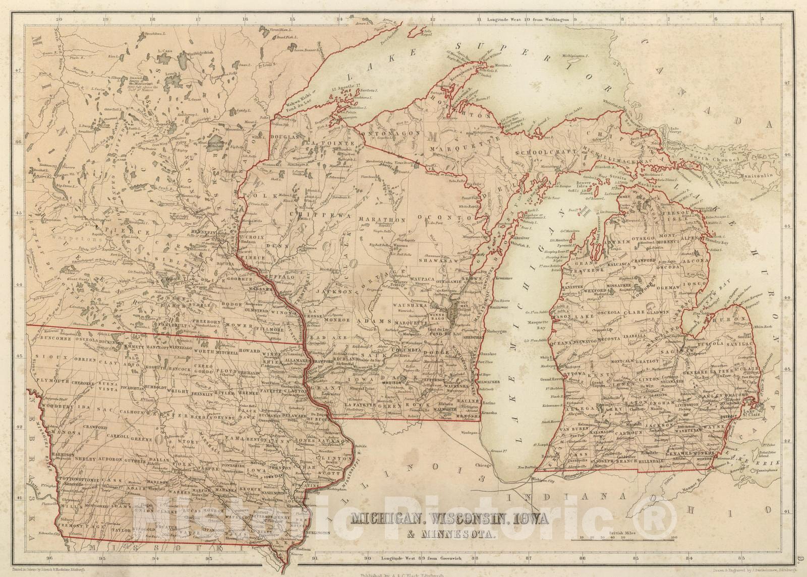 Historic Map : National Atlas - 1856 Michigan, Wisconsin, Iowa, Minnesota. - Vintage Wall Art