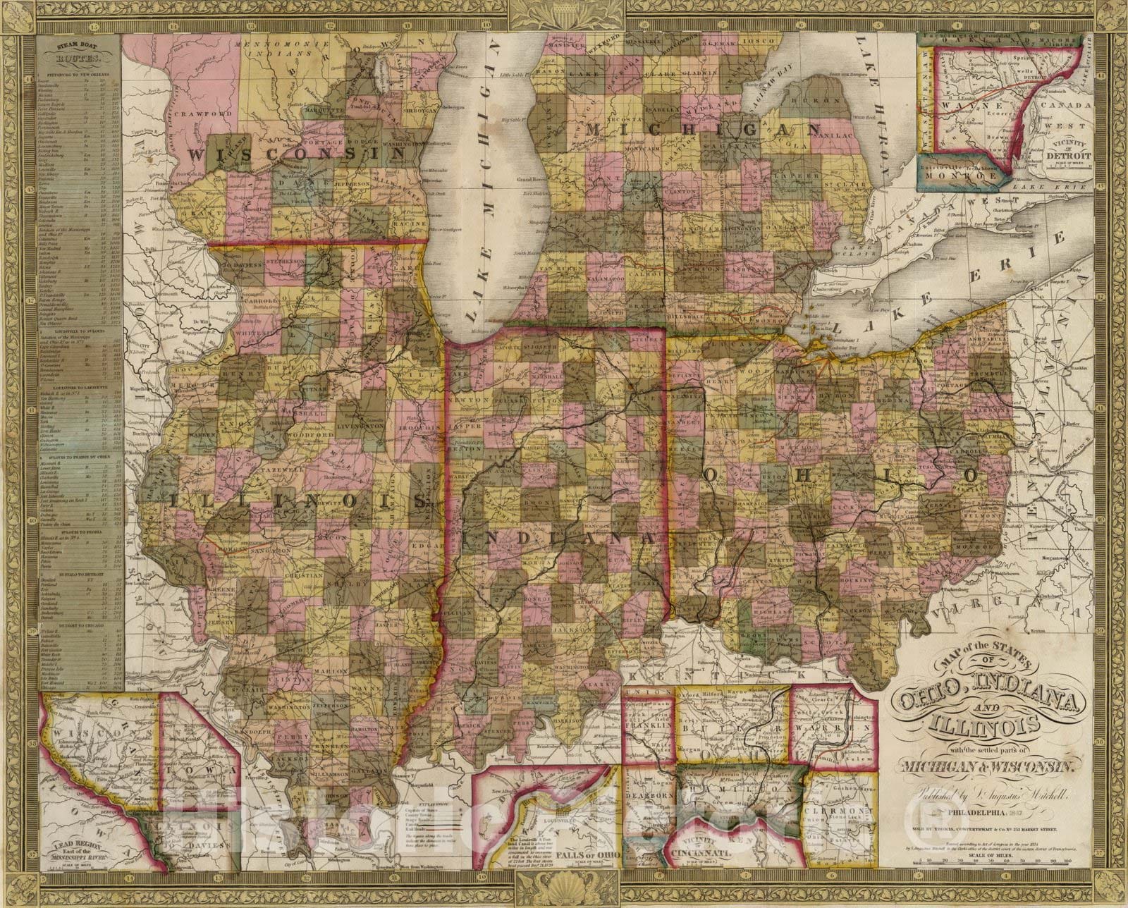 • .Historic Map : Pocket Map, Ohio, Indiana, Illinois, Michigan & Wisconsin 1847 - Vintage Wall Art