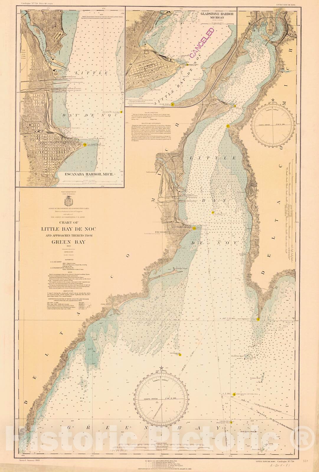 Historic Nautical Map - Chart Of Little Bay De Noc And Approaches Thereto From Green Bay, 1933 NOAA Chart - Michigan (MI) - Vintage Wall Art