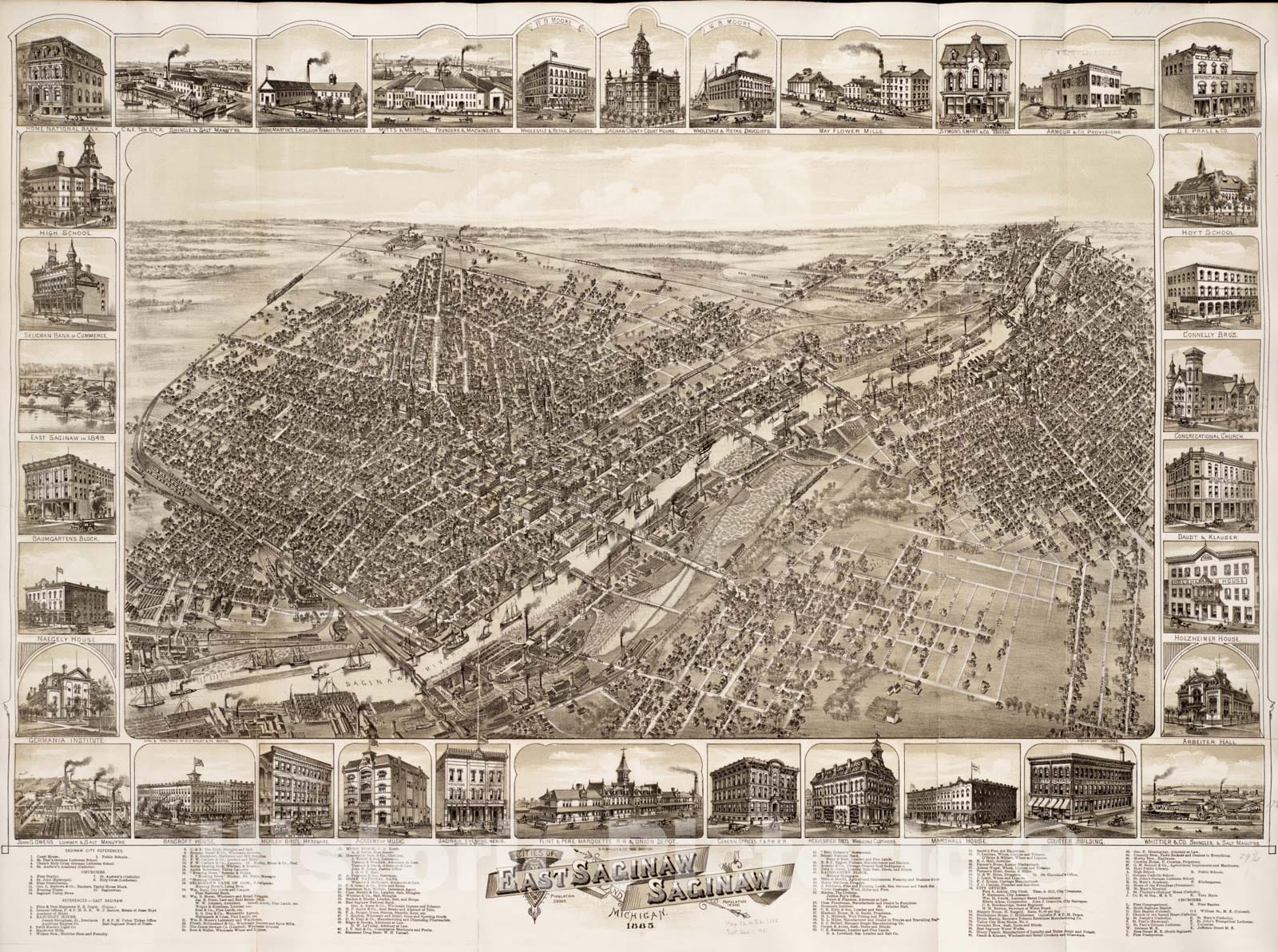 Historical Map, Cities of East Saginaw and Saginaw, Michigan, 1885, Vintage Wall Art