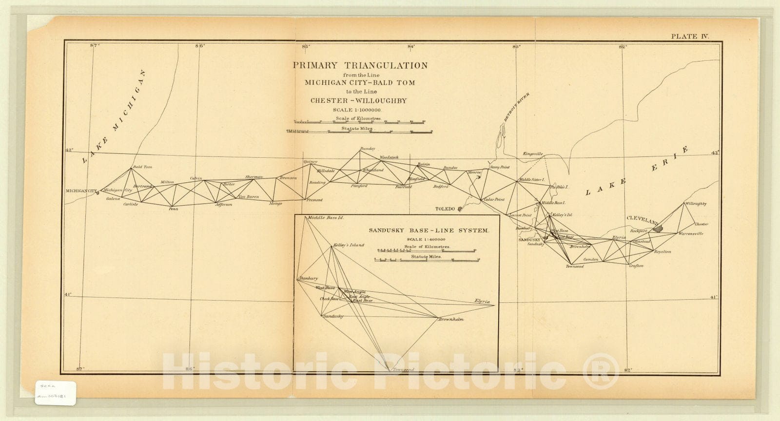Map : Lake Michigan to Lake Erie 1890, Primary triangulation from the line Michigan City - Bald Taom to the line Chester - Willoughby, Antique Vintage Reproduction