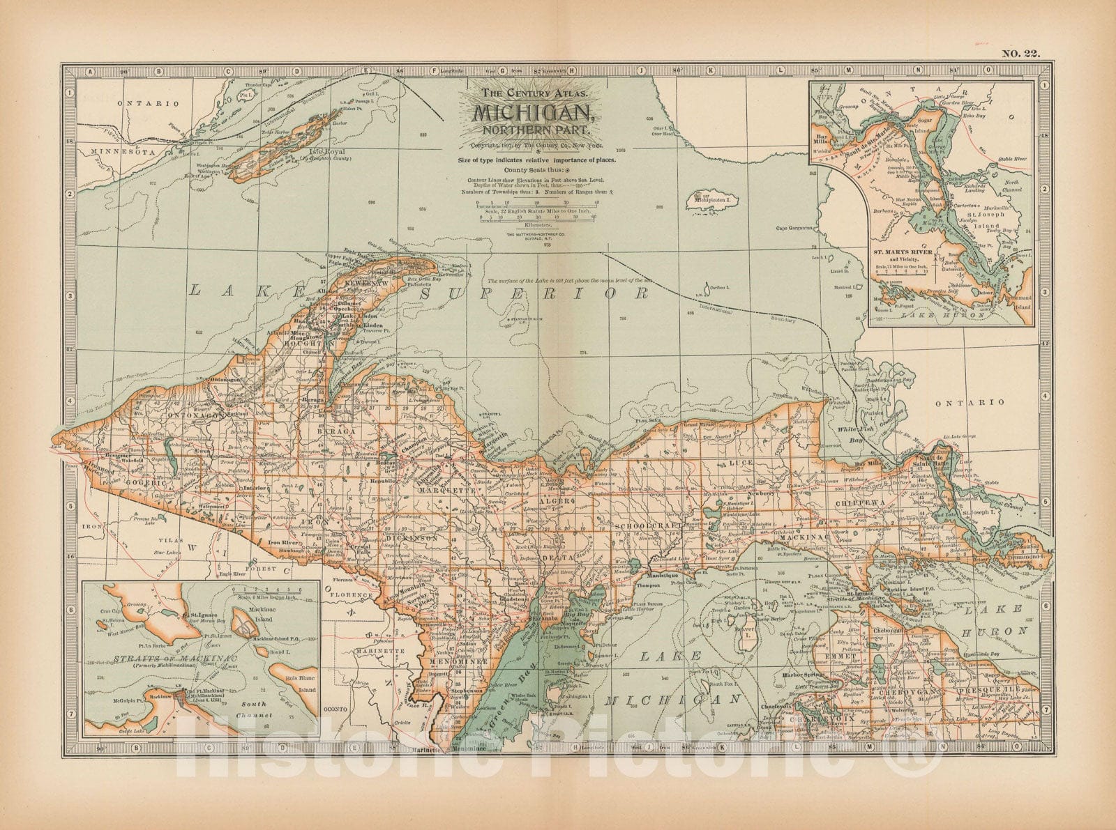 Historic Map : Michigan 1897 , The Century Atlas World , v2, Vintage Wall Art