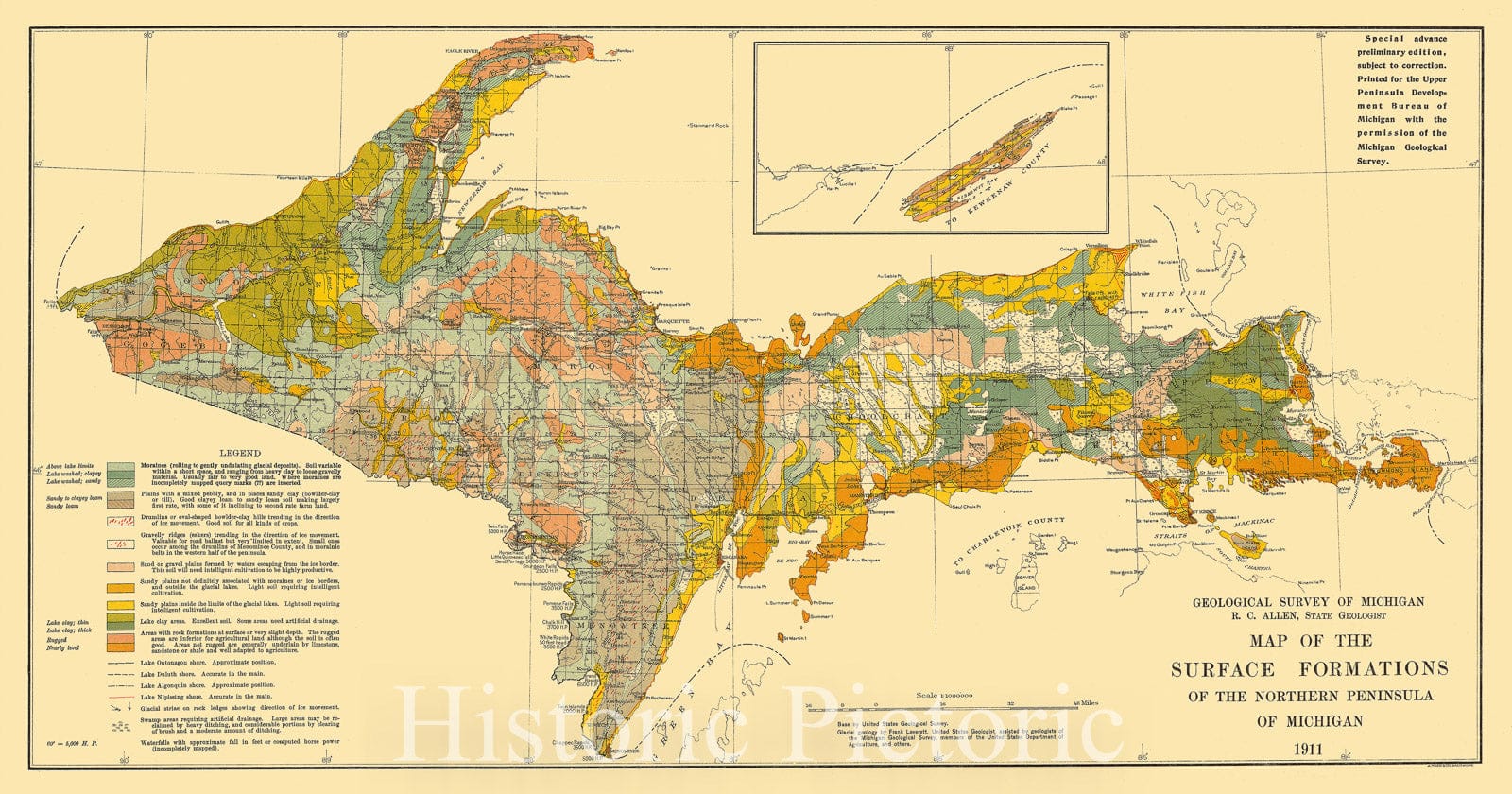 • Map : Michigan 1924, Map of the surface formations of the southern peninsula of Michigan , Antique Vintage Reproduction