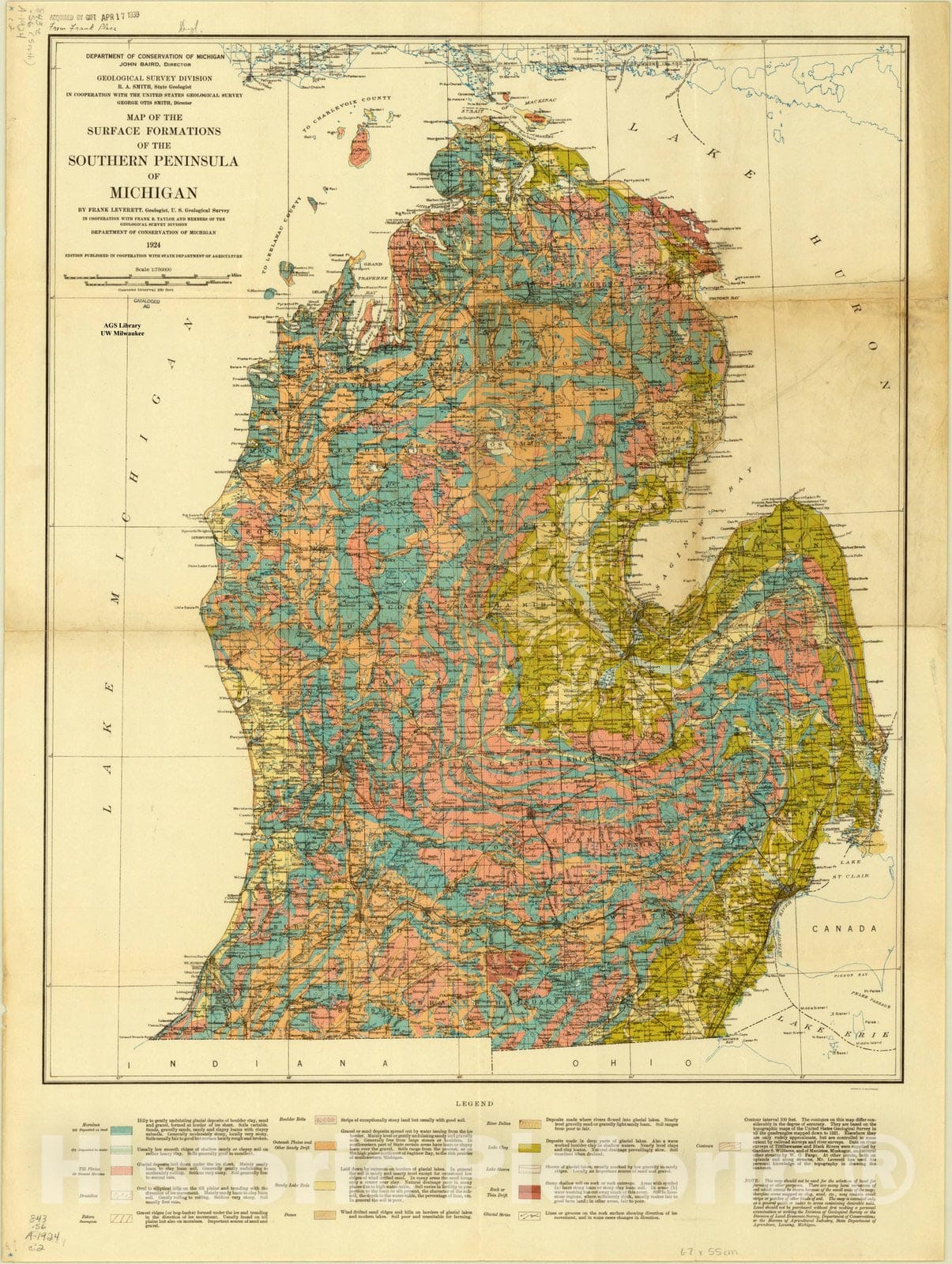 • .Map : Michigan 1924, Map of the surface formations of the southern peninsula of Michigan , Antique Vintage Reproduction