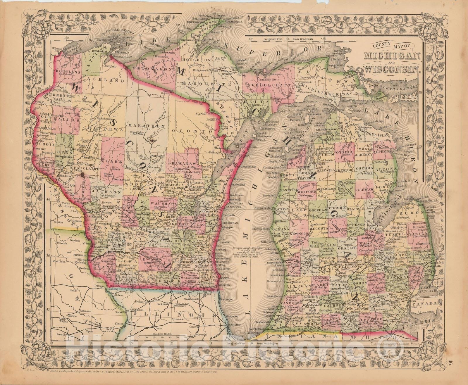 Historic Map : Michigan & Wisconsin 1867 , New General Atlas , Vintage Wall Art