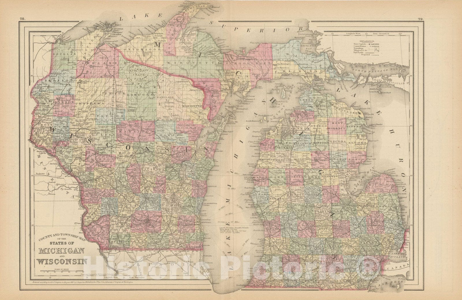 Historic Map : Michigan & Wisconsin 1882 , Mitchell's New General Atlas , Vintage Wall Art