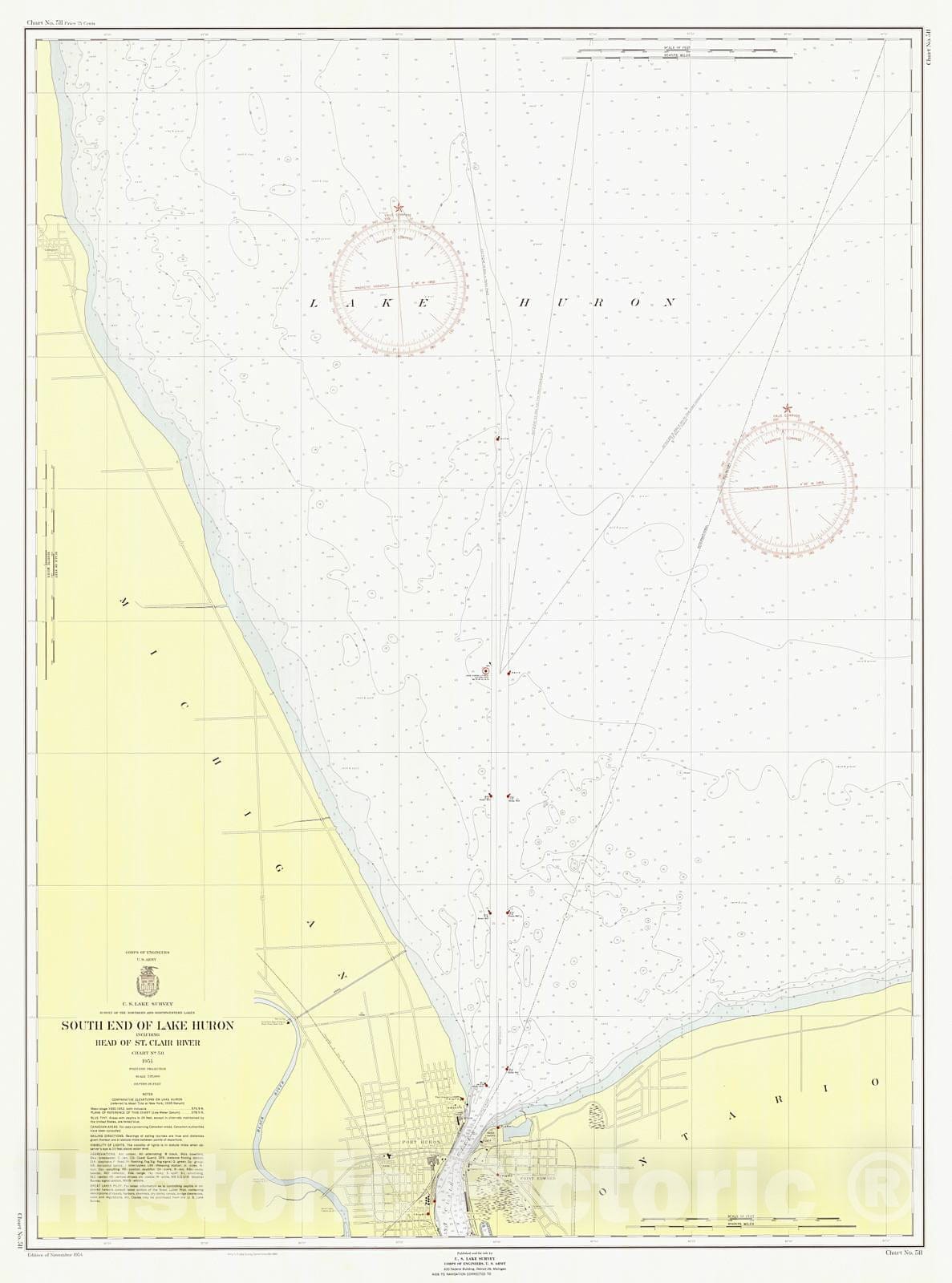 • .Historic Nautical Map - South End Of Lake Huron Including Head Of St Clair River, 1954 NOAA Chart - Michigan (MI) - Vintage Wall Art