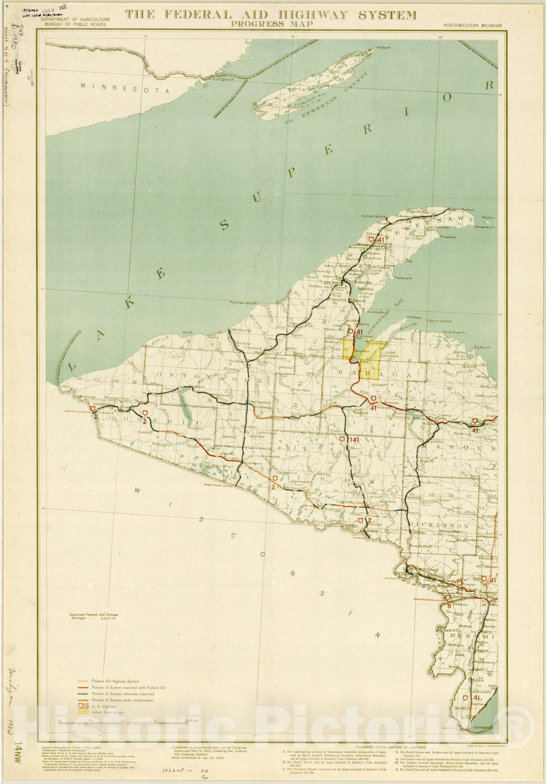 Map : Upper Penninsula, Michigan 1930, The federal aid highway system progress map ...Michigan, Antique Vintage Reproduction