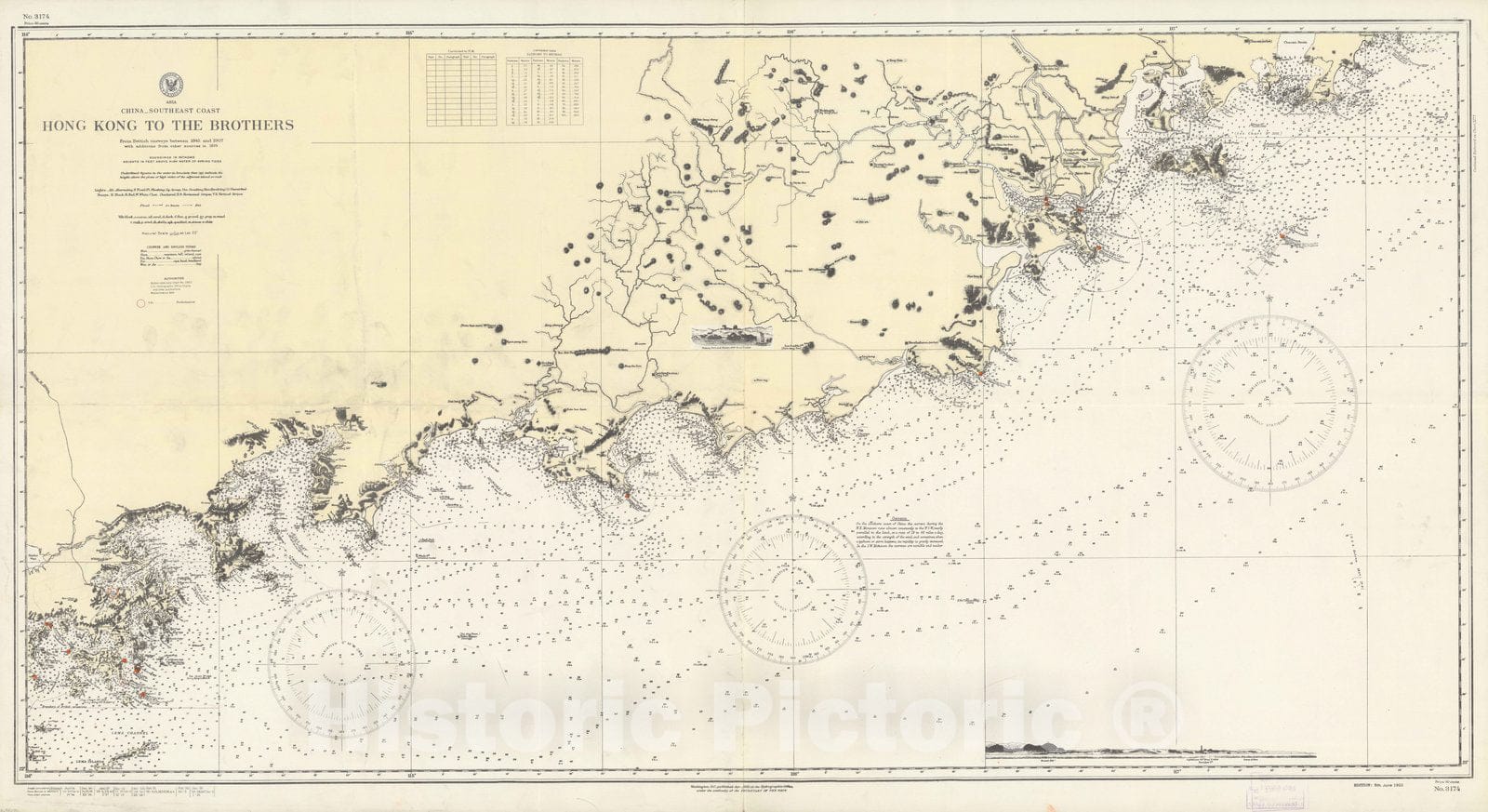 U.S. Navy. Hydrographic Office. Asia. China - Southeast Coast : Hong Kong to Brothers. From British survey between 1845 and 1907 with additions from other sources in 1899. Small correction from notices to Mariners from other sources: Printed : Apr., 24- Jan., 35. Washington, D.C. Published Apri. 1916 at the Hydrographic Office, under the authority of the Secretary of the Navy. Edition 5th. June 1922. No. 3174. Prince 50 cents. Various places marked in red. | U.S. Navy. Hydrographic Office. Asia. China - Southeast Coast : Hong Kong to Brothers. From British survey between 1845 and 1907 with additions from other sources in 1899. Small correction from notices to Mariners from other sources: Printed : Apr., 24- Jan., 35. Washington, D.C. Published Apri. 1916 at the Hydrographic Office, under the authority of the Secretary of the Navy. Edition 5th. June 1922. No. 3174. Prince 50 cents. |