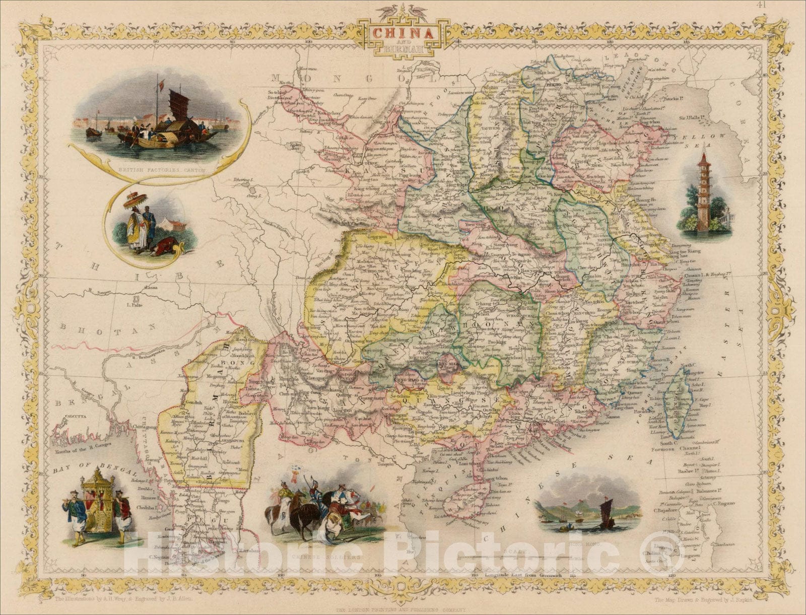 Historic Map : China and Birmah (Early naming and view of Hong Kong), 1851, John Tallis, Vintage Wall Art
