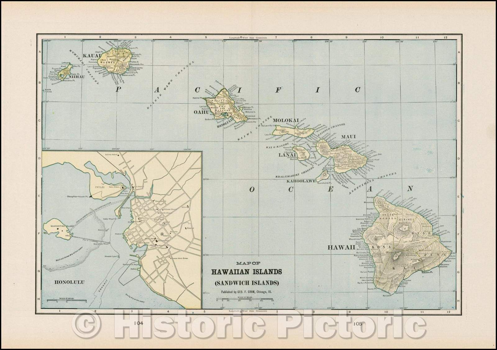 Historic Map - Map of Hawaiian Islands (Sandwich Islands) (with large Honolulu Inset), 1900, George F. Cram - Vintage Wall Art