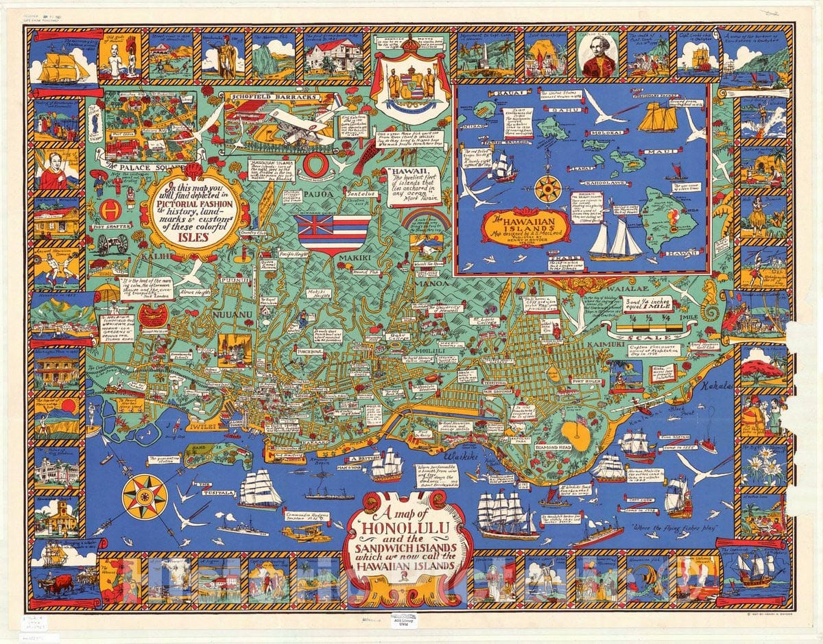 • Map : Honolulu, Hawaii 1927, A map of Honolulu and the Sandwich Islands, which we now call the Hawaiian Islands, Antique Vintage Reproduction