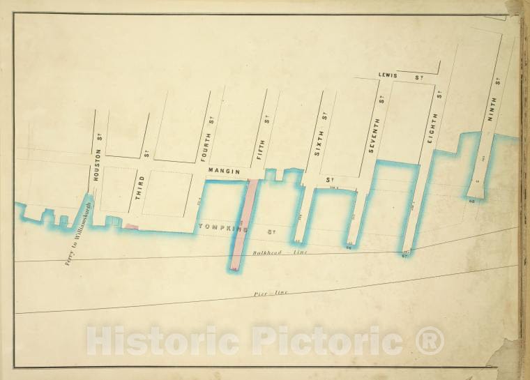 • .Historic Map - 1860 New York (N.Y.) [Mangin, Lewis, Ninth, Pier - Line 66-68, Houston; Tompkins, Ferry To Williamsburgh, Third, Fourth, Fifth, Sixth, Seventh, Vintage Wall Art