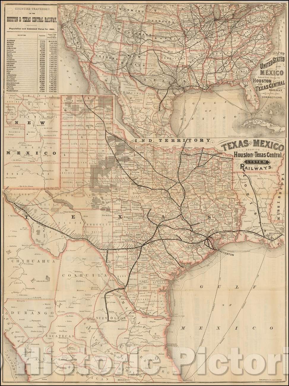 Historic Map - Texas and Mexico Showing Houston and Texas Central System of Railways, 1885, Rand McNally & Company - Vintage Wall Art