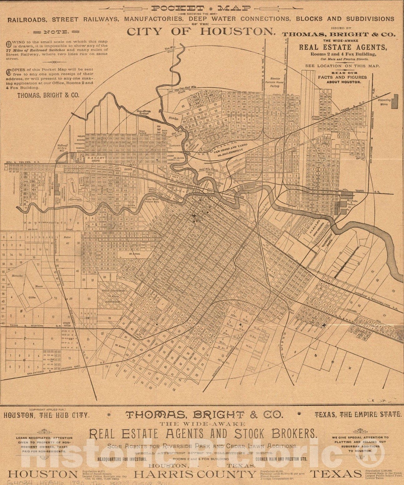 • .Historical Map, 1890 Pocket map Showing The Railroads, Street Railways, manufactories, deep Water Connections, Blocks and subdivisions of The City of Houston, Vintage Wall Art