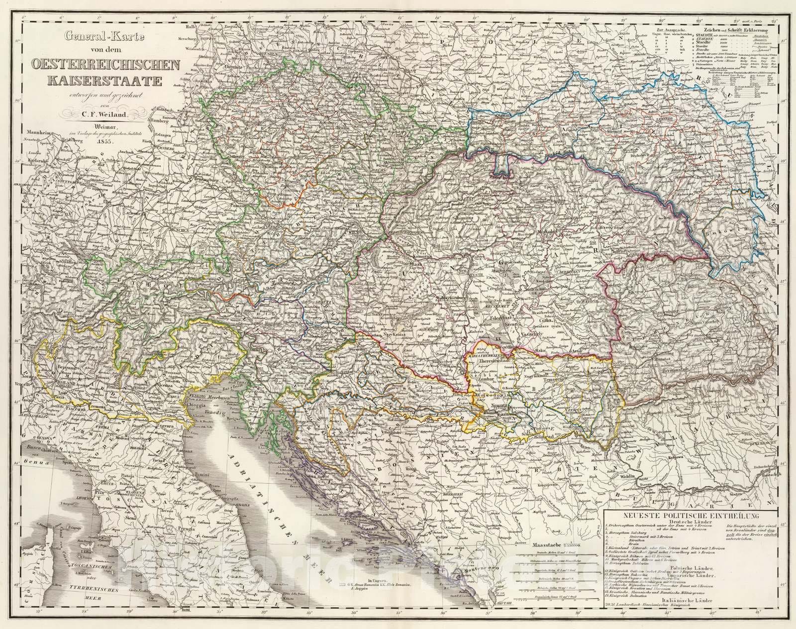 • .Historic Map : Austria; Hungary, Balkan Peninsula 1855 Oesterreich. Kaiserstaate. , Vintage Wall Art
