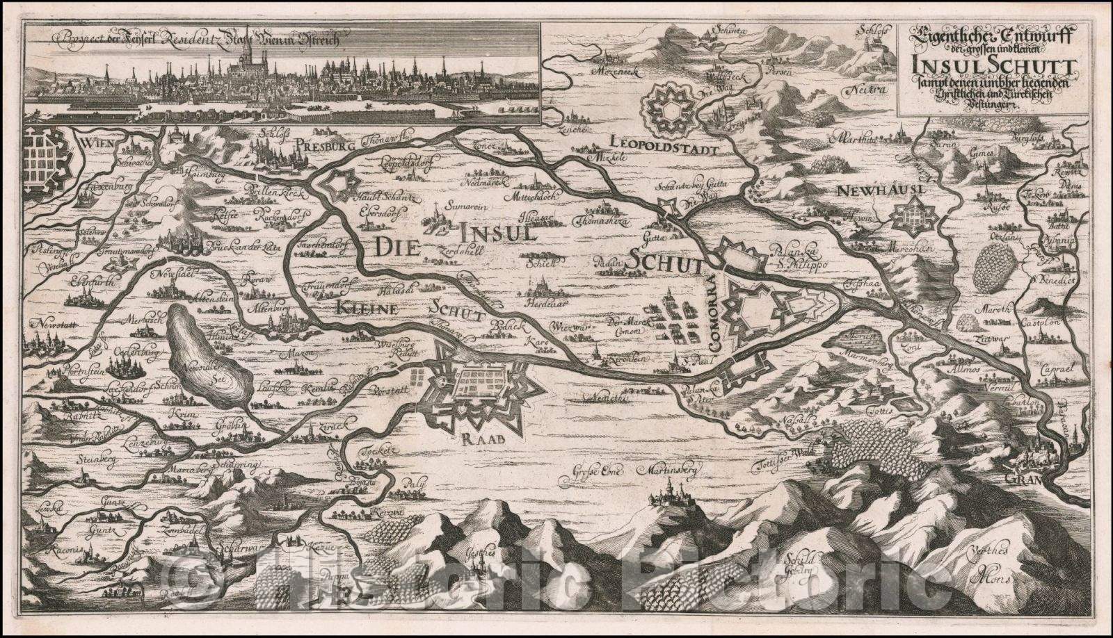 • .Historic Map - Eigentlicher Entwurff der Grossen unde Kleinen Insul Schutt/Map of Hungary, published at the end of the 17th Century, 1688 - Vintage Wall Art