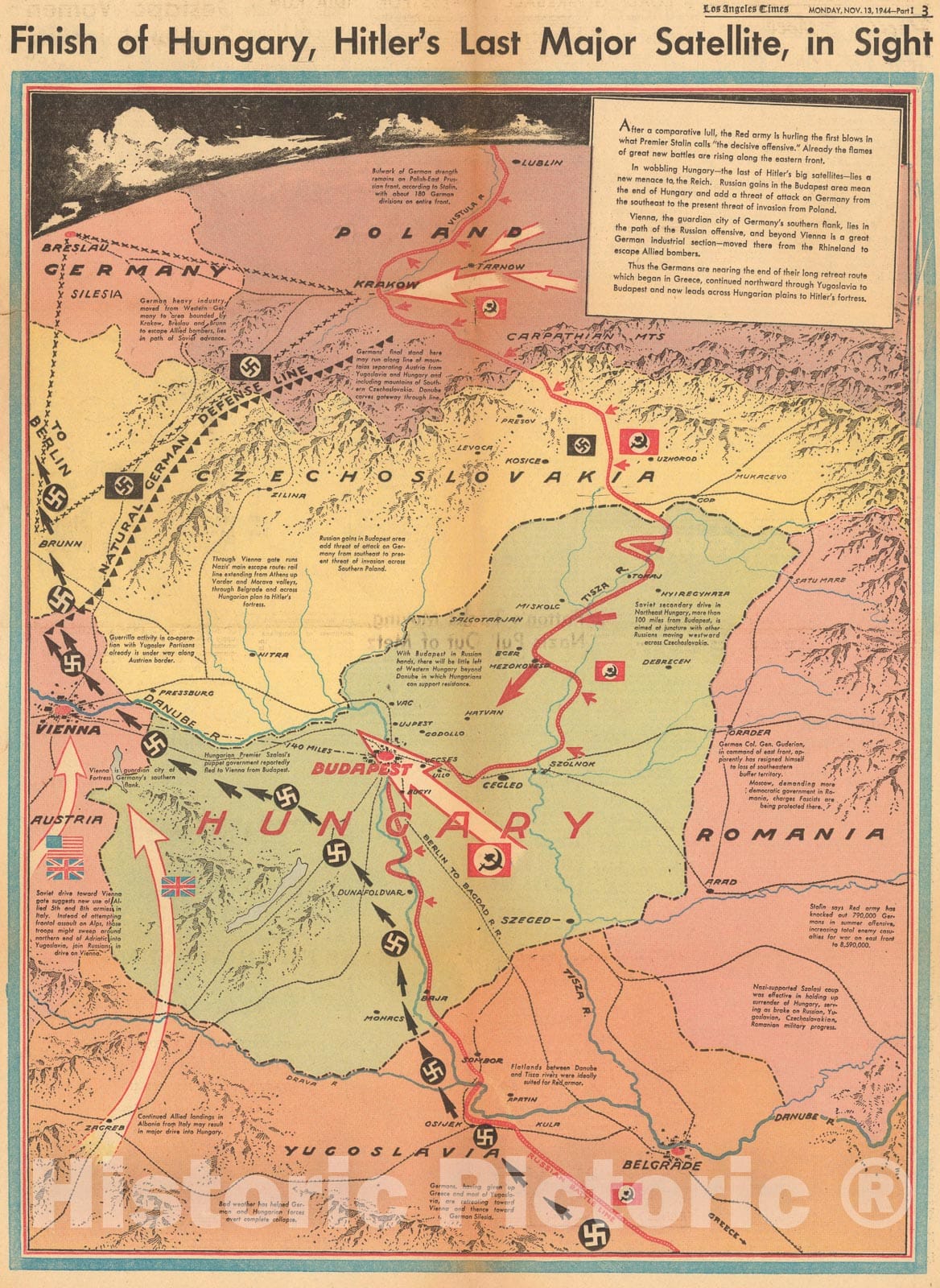 • .Historic Map : Finish of Hungary, Hitler's last major satellite, in sight, 1944, Vintage Wall Art