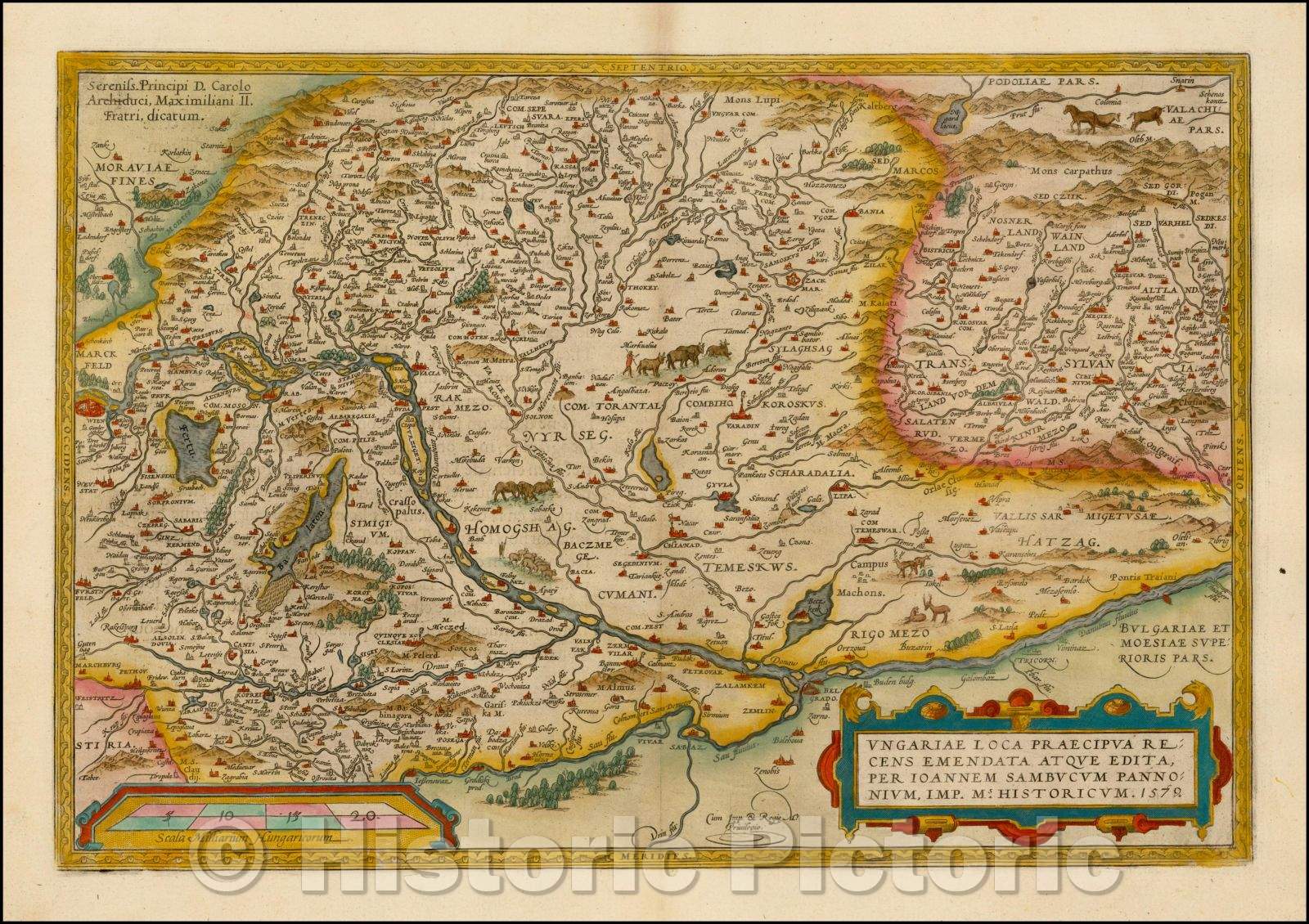 Historic Map - Hungariae Loca Praecipua Recens Emendata/The recent climate Notes Volume in Hungary, 1574, Abraham Ortelius - Vintage Wall Art