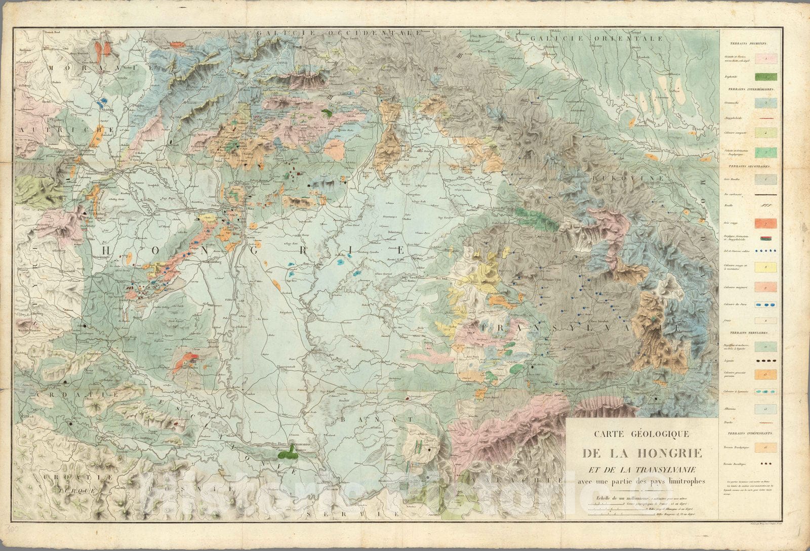 Carte Geologique de la Hongrie et de la Transylvanie avec une partie des pays limitrophes, | Carte Geologique de la Hongrie et de la Transylvanie avec une partie des pays limitrophes, | Hand colored. Relief shown by hachures. Francois-Sulpice Beudant (1787-1850) was a French mineralogist and geologist sent in 1818 on a scientific expedition to Hungary (and associated dominions) by the French court. The results of his researches, Voyage min�ralogique et g�ologique en Hongrie, 3 vols 4to, with atlas, published in 1822, established for him a European reputation. His detailed account of this expedition contains descriptions of opal deposits and the opal mining industry.