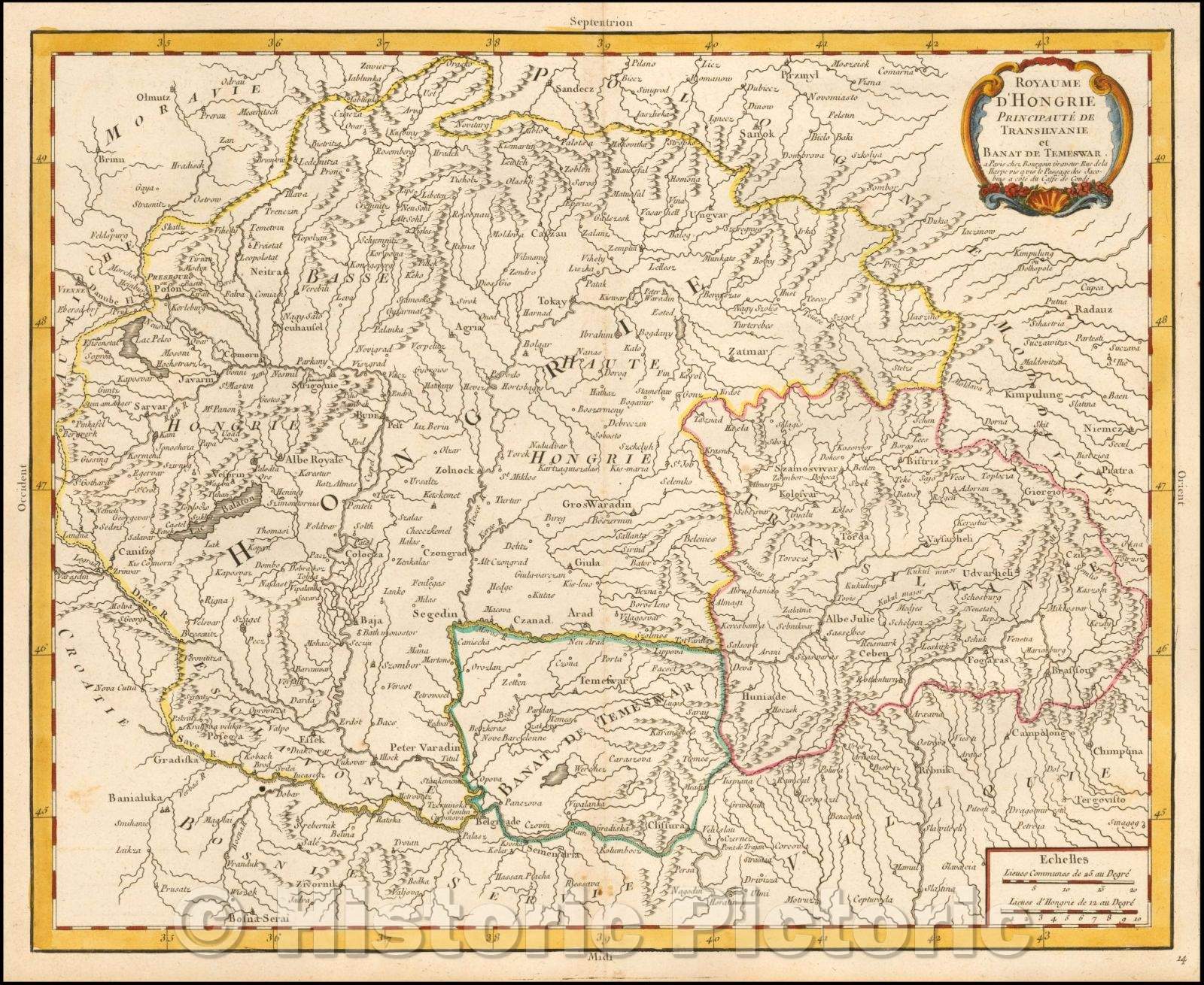 Historic Map - Royaume d'Hongrie Principaute de Transilvanie et Banat de Temeswar/Map of Hungary, published in Paris by Pierre Bourgoin, 1743, - Vintage Wall Art