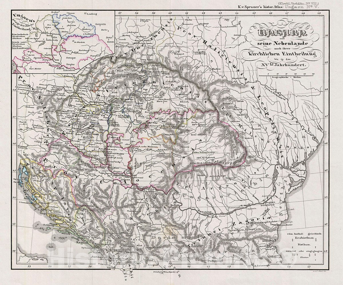 This is Karl von Spruner's 1854 map of Hungary detailing its ecclesiastical divisions in the 15th century. The map covers all of Hungary along with an inset map detailing Hungary's current (c. 1854) ecclesiastical division. The whole is rendered in finely engraved detail exhibiting throughout the fine craftsmanship of the Perthes firm. Prepared by Karl Spruner for publication as plate U V in the second edition of Justus Perthes' 1854 Historich-Geographischer, Hand-Atlas zur Geschichte der Staaten europa's vom Anfang des Mittelalters bis auf die Neueste Zeit.