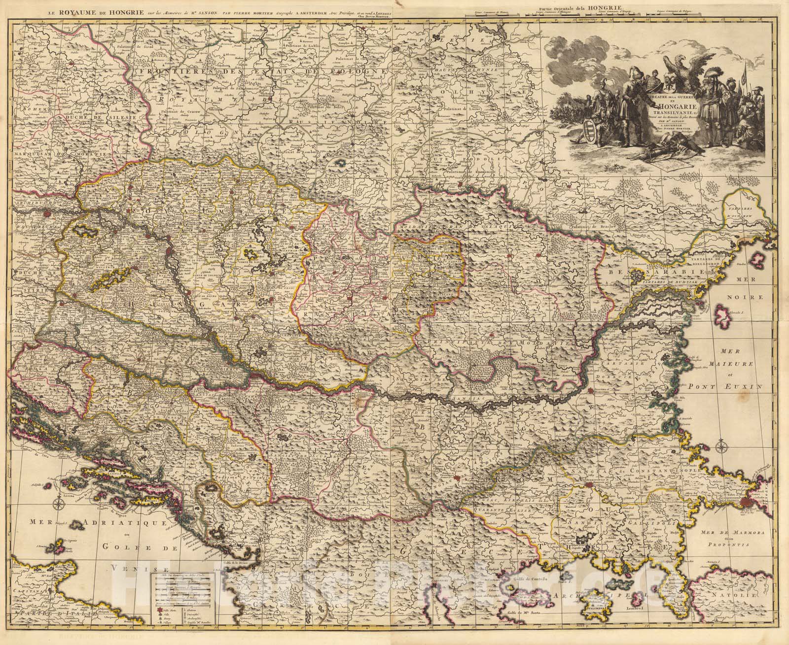 (Composite of) Theatre de la Guerre en Hongarie. | Atlas Nouveau Contenant Toutes Les Parties du Monde, ou Sont exactement Remarques Les Empires, Monarchies, Royaumes, Estats, Republiques & Peuples qui fy trouuent a present. Par le Sr. Sanson, Geographe ordinaire du Roy. Presente a Monseigeur le Dauphin ... Hubert Jaillot Geographe du Roy. A Paris, Chez Hubert Jaillot .... | This issue of the Mortier/Jaillot Atlas Nouveau has 169 maps (1 more than the normal count of 168) plus diagrams, text pages, decorated titles and index pages. It is noted for the large number of multi-sheet "Theatre de la Guerre" (Theater of War) maps covering the battles raging in Europe and the Americas during the Spanish War of Succession (1701-1713) and the Northern War (1700-1721). The Atlas Nouveaux was first published by Jaillot in Paris in 1681(46 maps) with later issues by him in 1684 (72 maps) and 1689 (80 maps). In 1692 Pierre Mortier published his first edition of the Jaillot atlas with 99 maps, another edition followed in 1696 with 111 maps. In 1707/1708 Mortier issued our edition with 168 maps. Later editions by Mortier expanded the atlas even further - 1708, 200 maps; ca 1721, 300 maps; ca 1735, 400 maps. The atlas maps are large folio size with most maps made of two sheets and many maps combining 4 or 6 sheets (those also issued as wall maps separately). The atlas is most impressive for its large size and number of maps as well as being up to date for its time. This copy colored in outline with relief shown pictorially.
