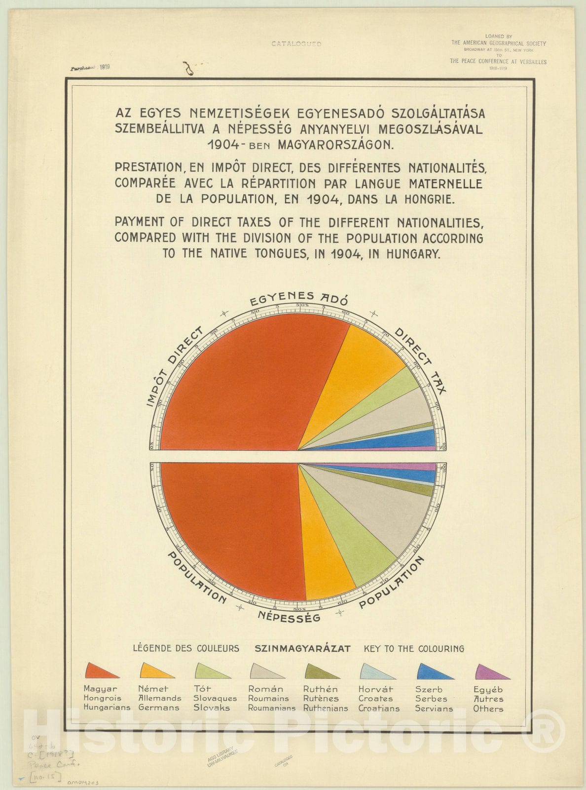 Az Egyes nemzetisegek egyenesado szolgaltatasa szembeallitva a nepesseg anyanyelvi megoszlasaval 1904-ben Magyarorszagon = Prestation en impo?t direct, des differentes nationalites, camparee avec la repartition par langue maternelle de la population, e