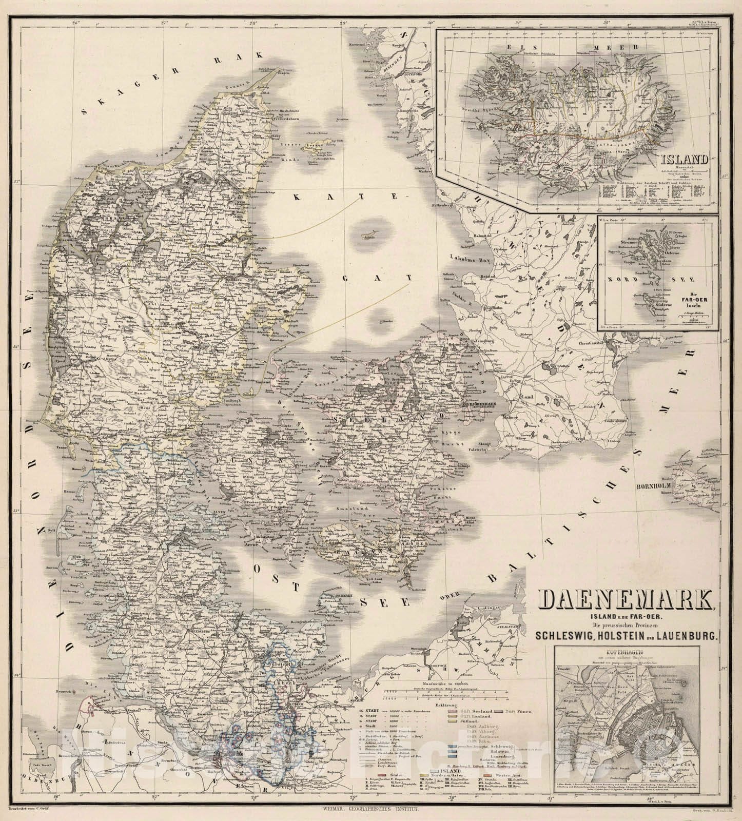 Historic Map : 1879 Denmark, Iceland, Faroe Island. Prussian Provinces Schleswig, Holstein and Lauenburg. - Vintage Wall Art