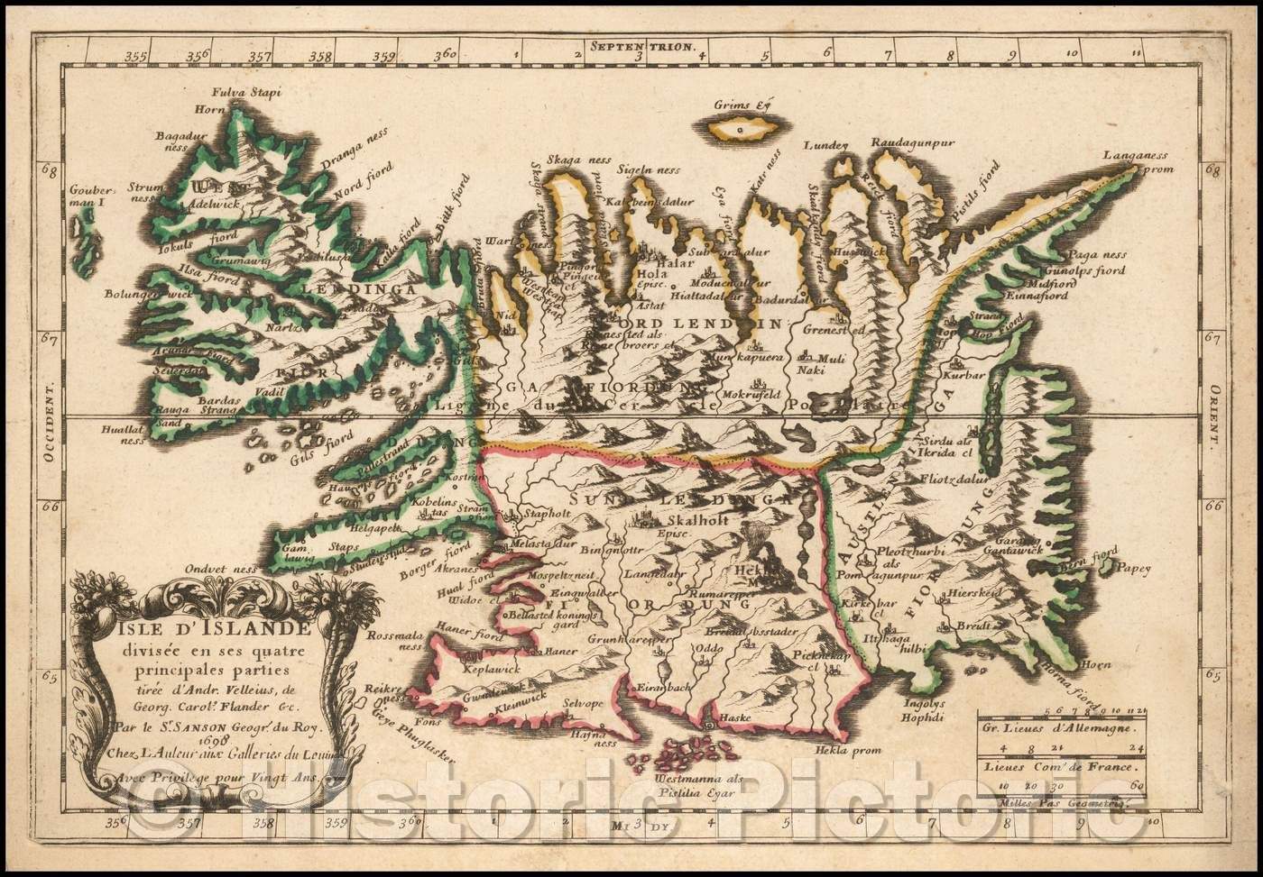 Historic Map - Isle D'Islande divisee en ses quatre principales tiree d'Andr. Velleius, de Georg. Carol. Flander &c/Map of Iceland, published by Sanson, 1698 - Vintage Wall Art