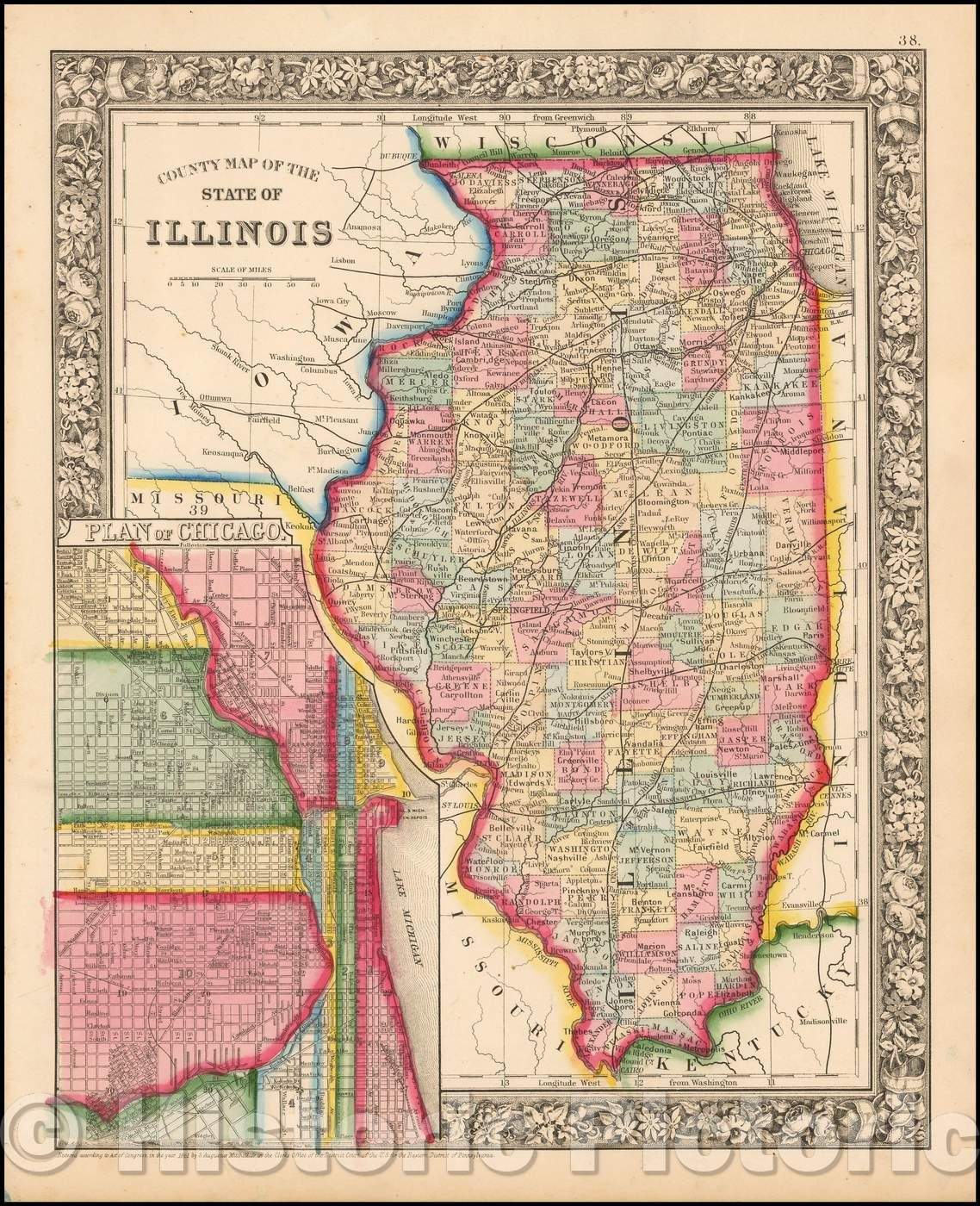 • Historic Map - County Map of the State of Illinois, 1864, Samuel Augustus Mitchell Jr. - Vintage Wall Art