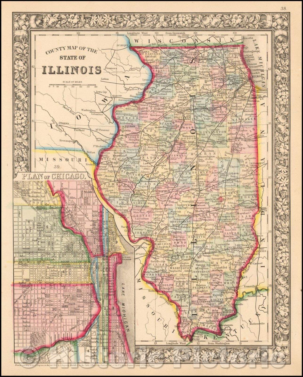 Historic Map - County Map of the State of Illinois, 1865, Samuel Augustus Mitchell Jr. - Vintage Wall Art