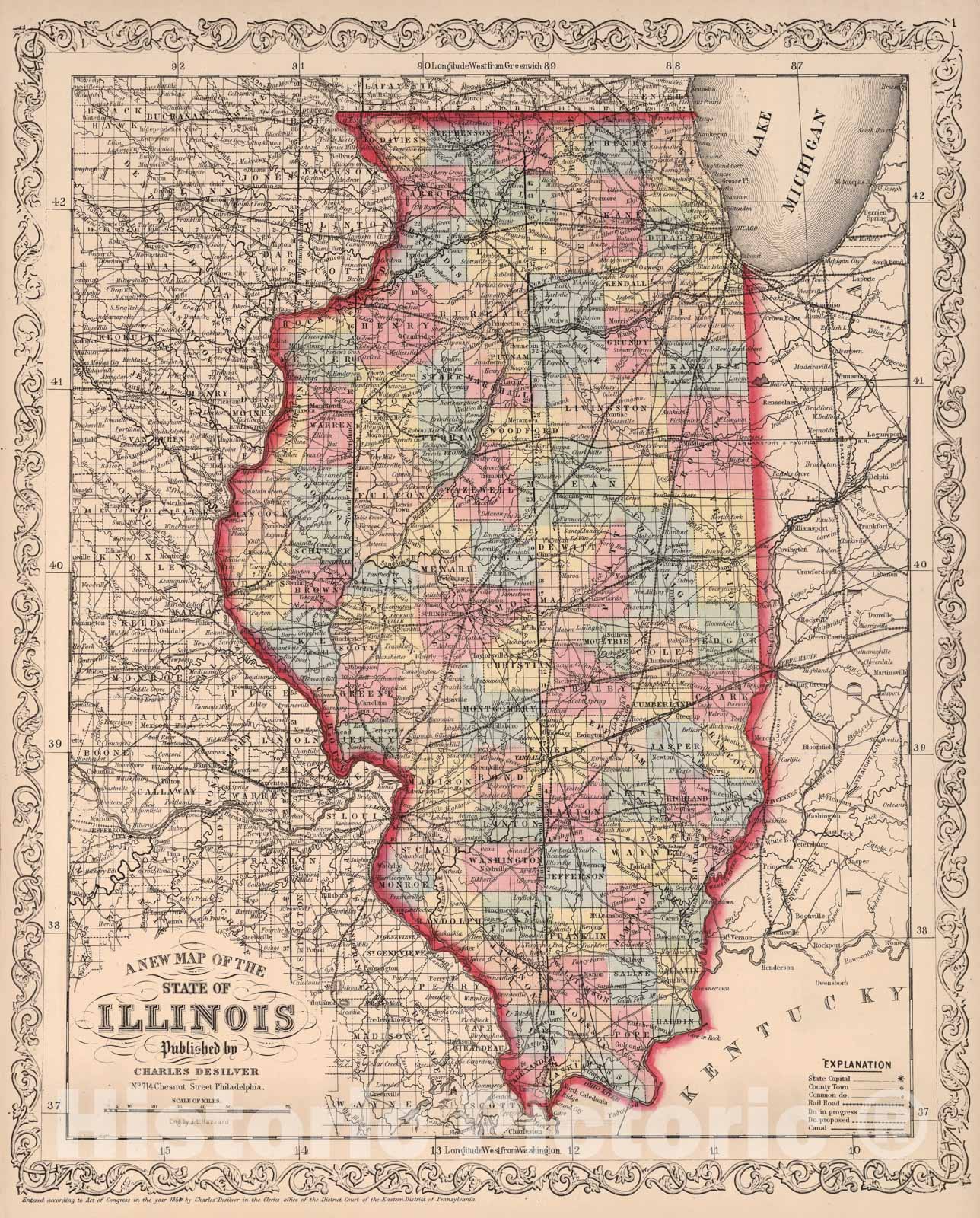 Historic Map - A New Map of the State of Illinois : Published by Charles Desilver, 1859 - Vintage Wall Art