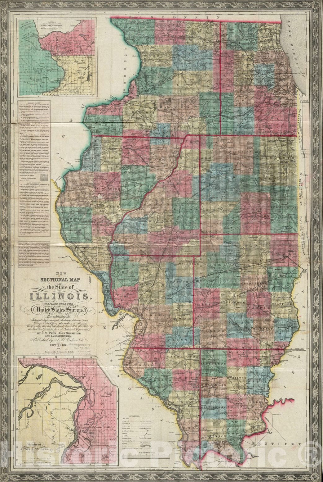 • Historical Map, 1852 New sectional map of The State of Illinois : compiled from The United States surveys, Also exhibiting The Internal improvements, Vintage Wall Art