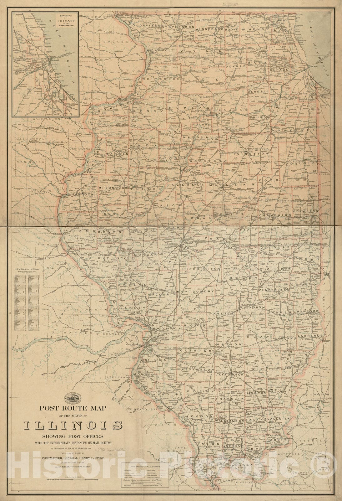 • Historical Map, Post Route map of The State of Illinois Showing Post Offices with The Intermediate Distances on Mail Routes in Operation on The 1st of December, 1903, Vintage Wall Art