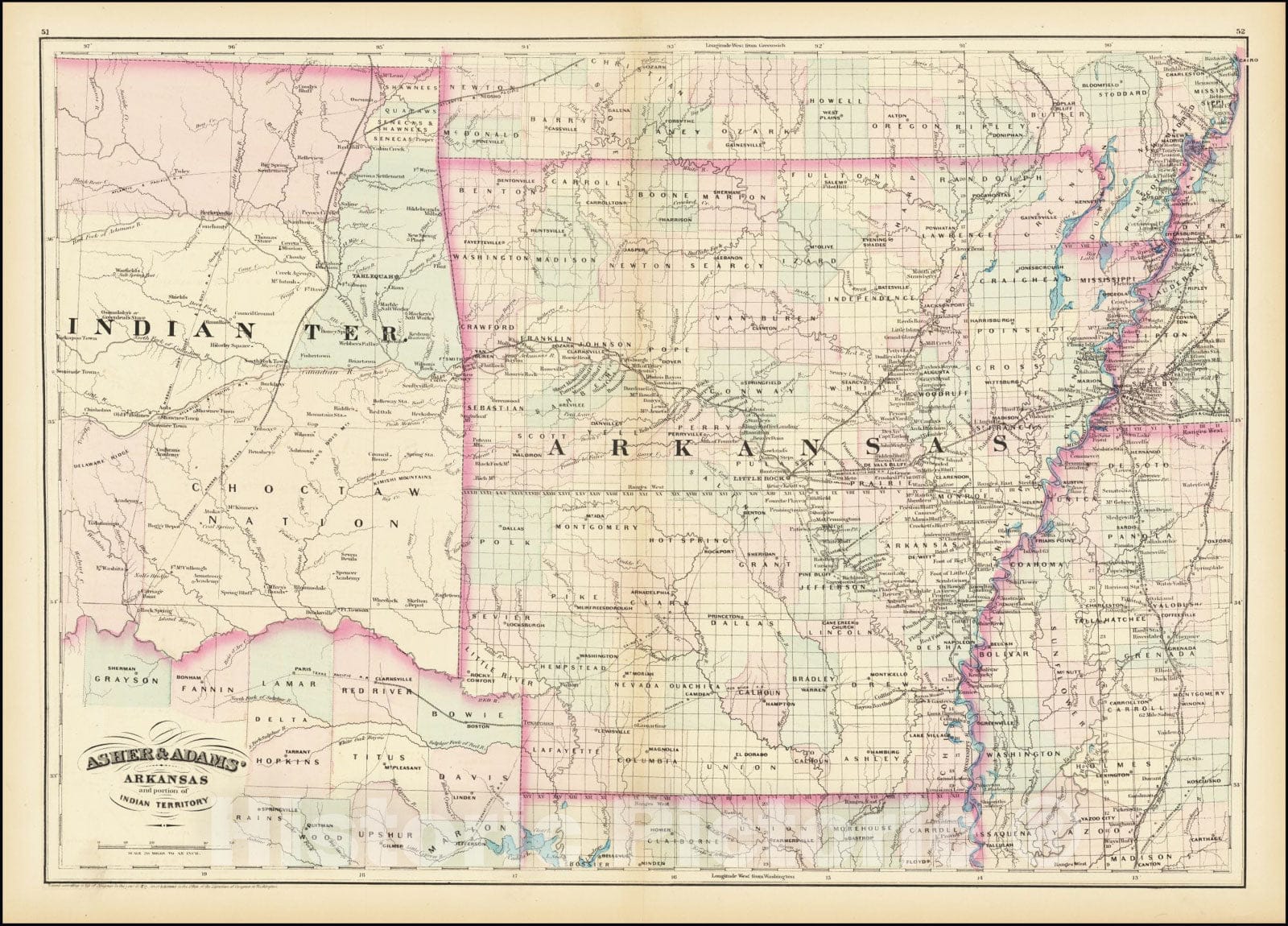 • .Historic Map : Asher & Adams' Arkansas and portion of Indian Territory, 1874, Vintage Wall Art