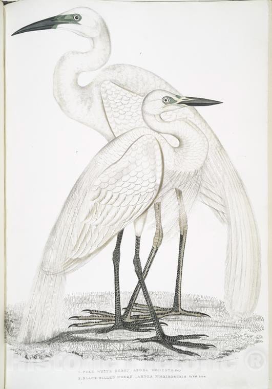 • .Historic 1830 Map - 1. Pure White Heron, Ardea Modesta; 2. Black Billed Heron, Ardea Nigrirostris. - Indiaillustrations Of Indian Zoology - Vintage Wall Art