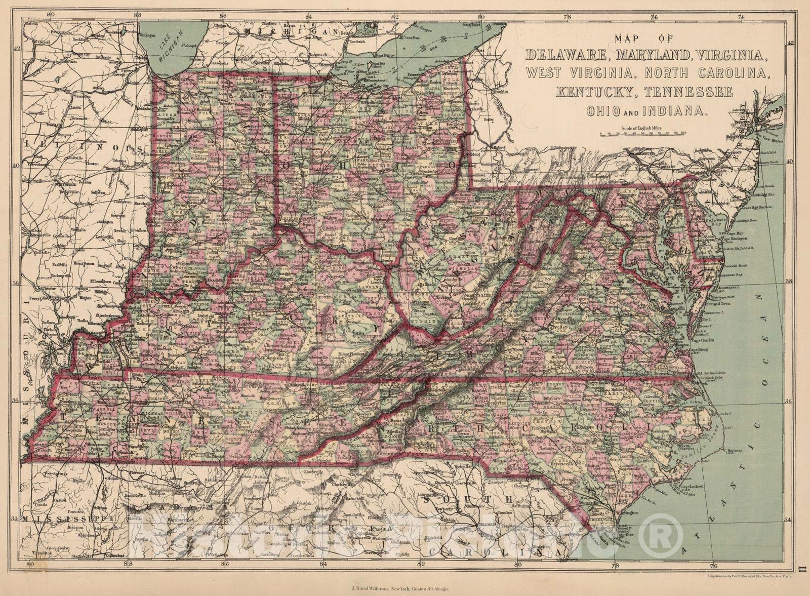 Historic Map : 1873 Map of Delaware, Maryland, Virginia, West Virginia, North Carolina, Kentucky, Tennessee, Ohio and Indiana : Vintage Wall Art