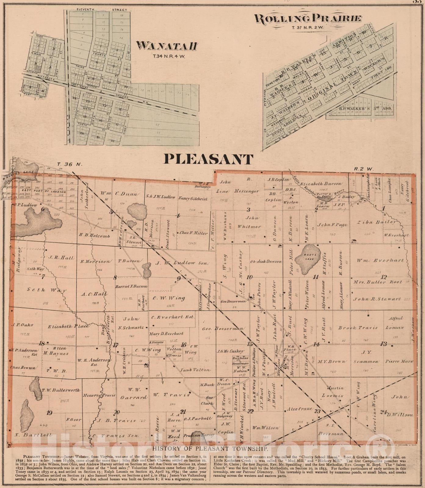 Historic Map : 1874 Pleasant Township, Laporte County, Indiana. Wanatah. Rolling Prairie, Laporte County, Indiana. - Vintage Wall Art