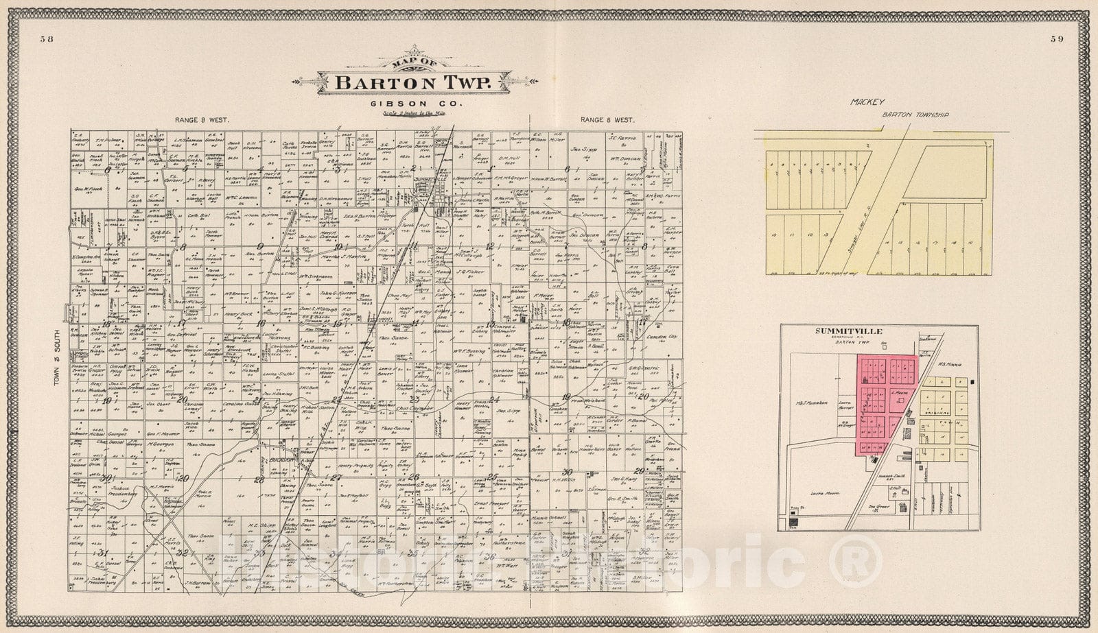 • .Historic Map : 1899 Barton Township, Gibson County, Indiana. Mackey. Summitville. - Vintage Wall Art